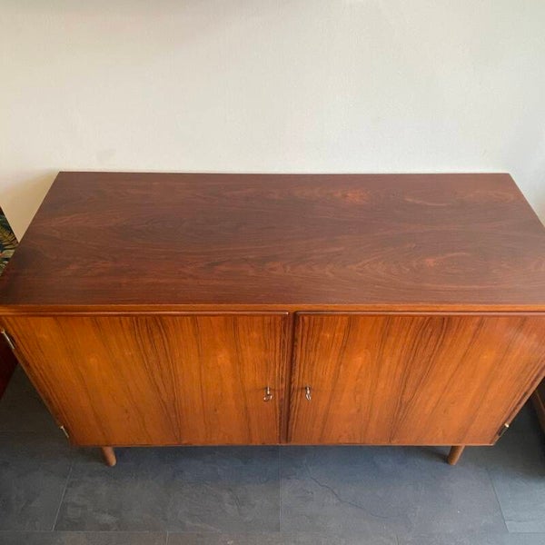 Een prachtig compact Deens dressoir van Hundevad, uitgevoerd in warm palissander fineer! De kast heeft links 3 in hoogte verstelbare laden en rechts 2 verstelbare planken. Het binnenwerk is uitgevoerd in een zware kwaliteit lichtkleurig (berken)hout. De kast is qua formaat makkelijk toe te passen in elke ruimte maar biedt voldoende ruimte om veel spullen op te bergen. Door de verstelbare laden en planken in combinatie met de juiste diepte is de kast ook geschikt om elpees en een platenspeler te plaatsen :-) Let ook op de mooie afwerking van de deuren; de ingelegde rand geeft blijk van vakmanschap en kwaliteit. De kast verkeert in een zeer mooie vintage staat. Aan de rechterzijkant is wat kleurverschil ontstaan en in een van de laden zijn wat lichte sporen van inkt o.i.d. zichtbaar. Zie ook de foto's die onderdeel vormen van de beschrijving.