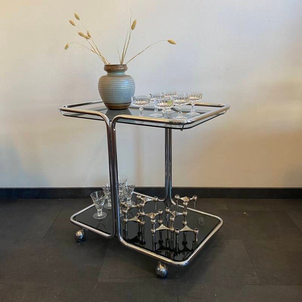 Zeer mooi gevormde en stijlvolle serveerwagen met een chromen frame en 2 rookglasplaten. De wagen verkeert in een goede staat met minimale gebruikssporen, zoals wat minimale oppervlakkige krasjes op het glas en patina bij de wielen. De onderste glasplaat heeft een chipje aan de rand, dit zie je niet omdat het aan onderkant zit, maar goed om te weten. Het doet niets af aan de stevigheid van het glas.