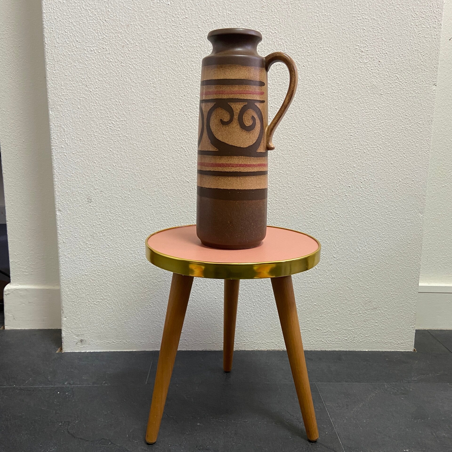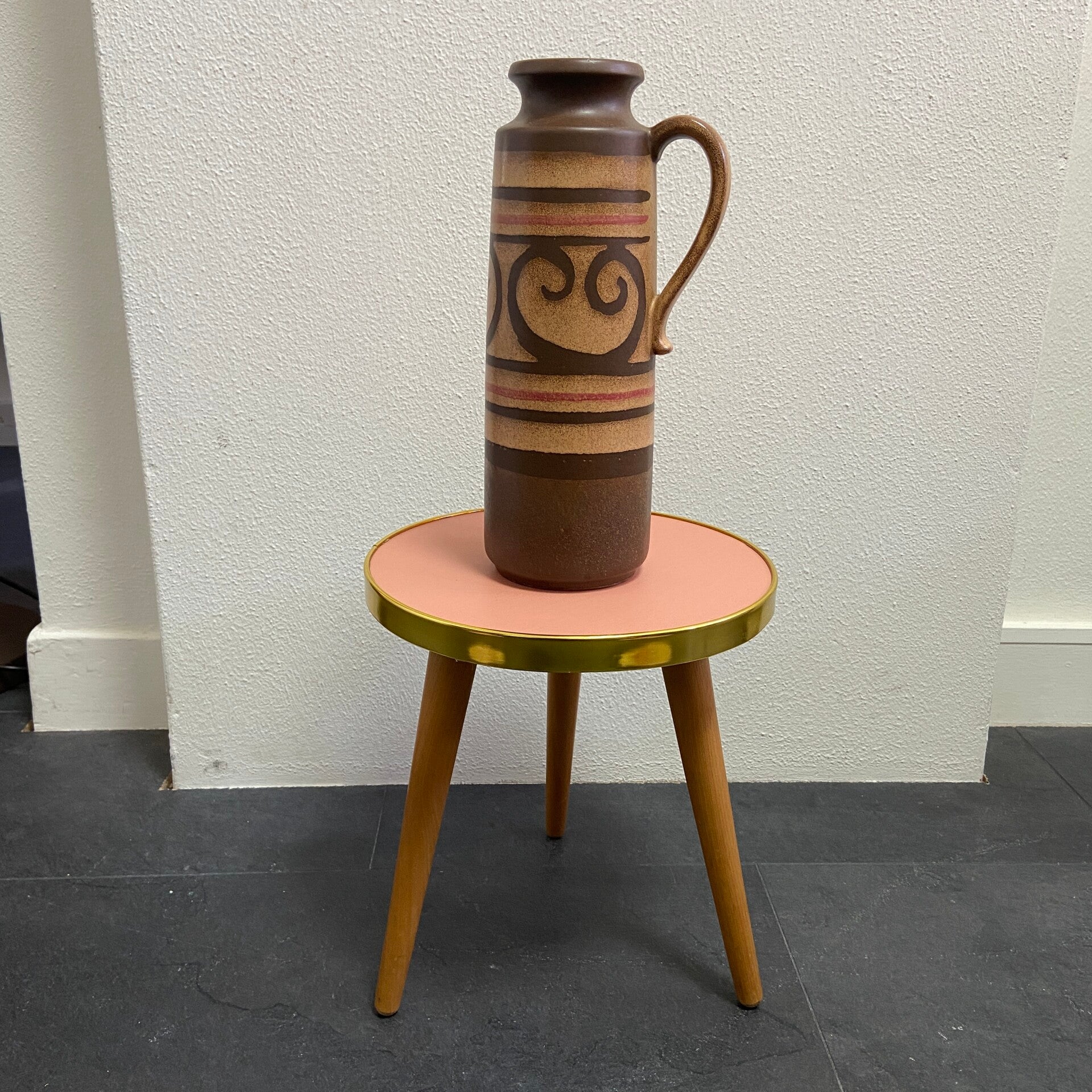 Dit mooie tafeltje heeft een vintage houten blad en poten, maar is voorzien van een nieuwe roze vinyl bekleding en messingkleurig kantenband. De tafel verkeert daardoor weer in zeer goede staat en kan weer jaren mee! De poten kunnen eraf voor vervoer.