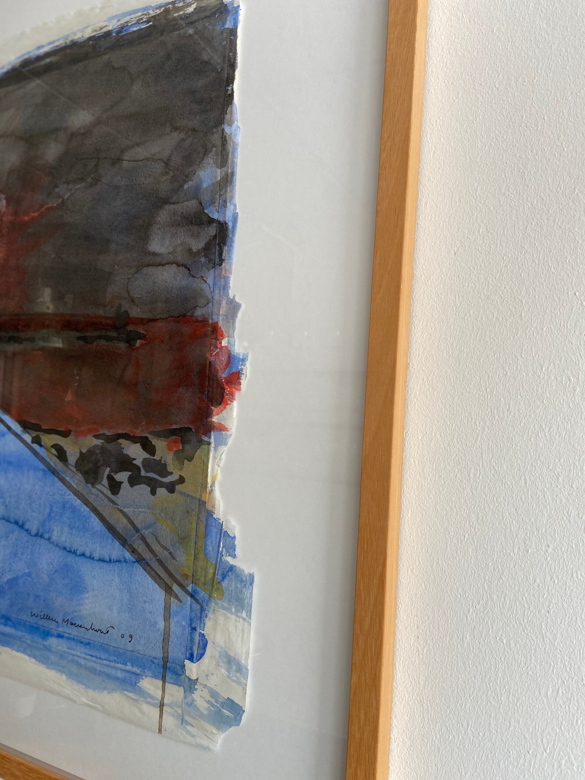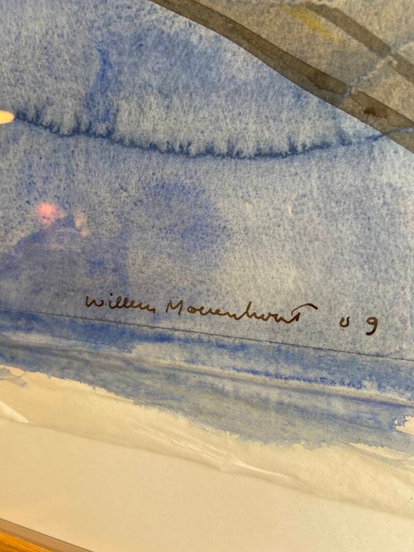 Kunstenaar Wim Moerenhout is geboren in 1940 te Utrecht en woonachtig geweest in Den Haag, waar hij zich liet inspireren door de natuur, zee en de haven. "In mijn werk maak ik gebruik van herkenbare vormen en beelden. Ik onderzoek de verhouding tussen kleur, beweging en emotie in het platte vlak. Mijn doel is een moderne figuratie." Kleurrijk aquarel, van Willem Moerenhout, gesigneerd en genummerd. Het aquarel is professioneel ingelijst in een houten lijst van zware kwaliteit.