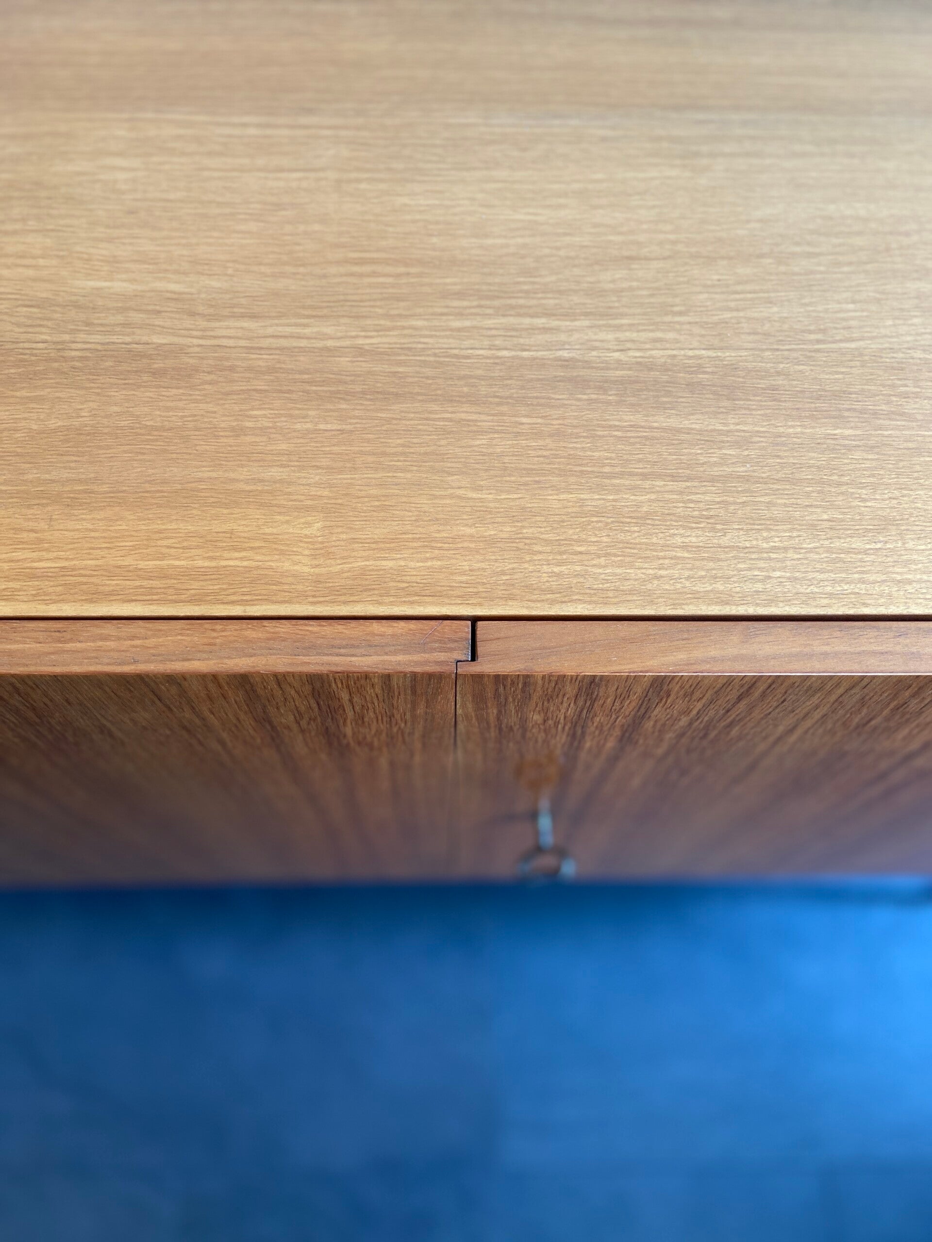 Zeer mooi dressoir van warm teakfineer op zwart metalen hairpinlegs. Het dressoir heeft 2 afsluitbare deuren met daarachter een plank. De binnenkant van het dressoir is uitgevoerd in berkenhout van een zware kwaliteit. De kast kenmerkt zich naast de hairpinlegs door mooie details zoals de messing scharnieren die aan de buitenkant van de kastdeuren zijn geplaatst, de sluiting van de deuren die in elkaar vallen en de mooie houttekening. De kast verkeert in zeer goede staat met minimale gebruikssporen in de vorm van wat oppervlakkige krasjes op het bovenblad en een reparatie met was aan de linkerzijwand, onderaan. Zie de foto's die onderdeel zijn van de beschrijving.