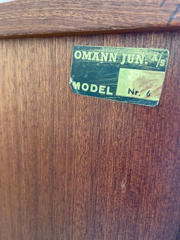 Zeer mooie Deense boekenkast, ontworpen door Gunni Omann, model 6, voor Jun's Møbelfabrik in de jaren '60. De kast is gemaakt van een zware kwaliteit teakfineer met een warme uitstraling en mooie houttekening. De planken zijn verstelbaar, dus je kunt alle formaten boeken plaatsen. Natuurlijk ook leuk voor je verzameling, decoratie e.d. De poten zijn er nieuw onder gezet. De kast verkeert in een goede staat met minimale gebruikssporen; rechtsonder op de plank is een lichte kring zichtbaar. Zie de foto's die onderdeel zijn van de beschrijving.