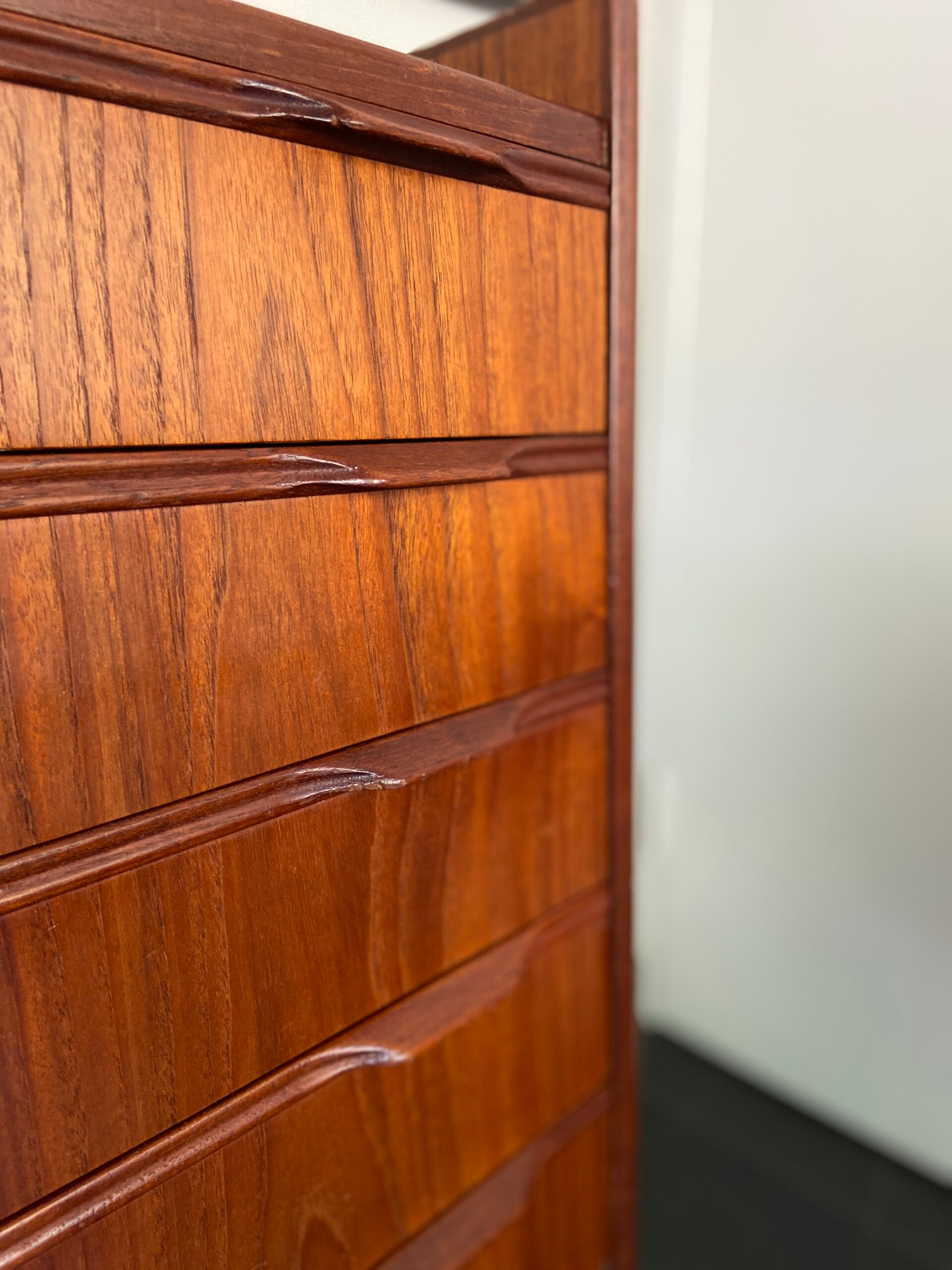 Elegante Deense ladekast van warm teakfineer met maar liefst 5 laden! De ladekast onderscheidt zich door de opstaande rand aan het bovenblad en heeft subtiel gevormde handgrepen. Door zijn compacte formaat in veel ruimten toe te passen; in de hal met een mooie spiegel erboven, in de slaapkamer, kinderkamer of woonkamer. De kast verkeert in buitengewoon mooie staat. Wat minimale gebruikssporen in 2 laden, zoals op de foto's te zien is.