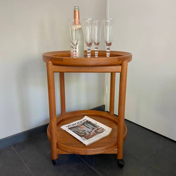 Deense serveerwagen/trolley van teakhout met een afneembaar bovenblad om te serveren. De wagen verkeert in goede vintage staat en de wielen rijden nog goed. Op het bovenblad zijn wat lichte gebruikssporen zichtbaar; zie hiervoor ook de detailfoto.