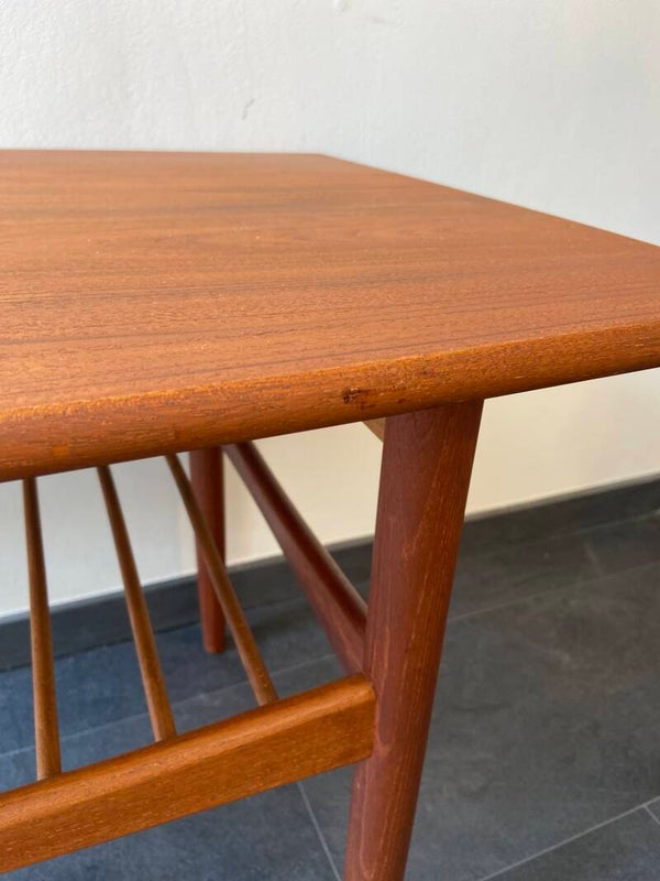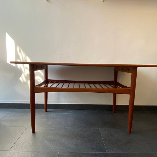Prachtige vintage koffietafel van deels massief en deel teakfineer. De vormgeving is typisch Scandinavisch en kenmerkt zich door de mooie afgeronde hoeken en de hoge kwaliteit van afwerking. De tafel heeft op een paar kleine plekjes aan de rand van het tijdschriftenrek na, nauwelijks gebruikssporen, hetgeen zeer bijzonder is gezien de leeftijd!