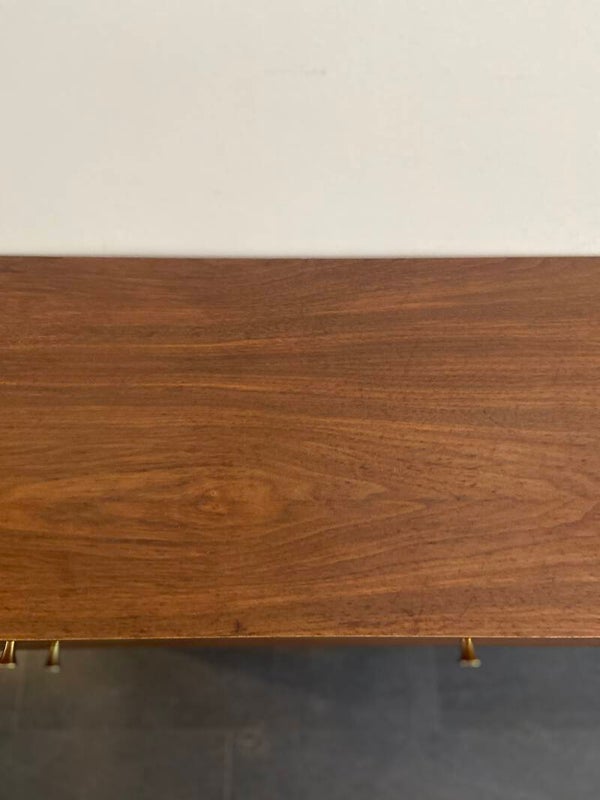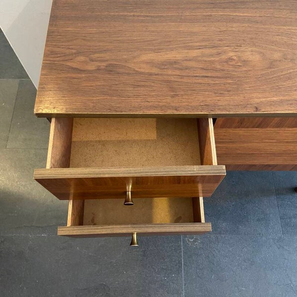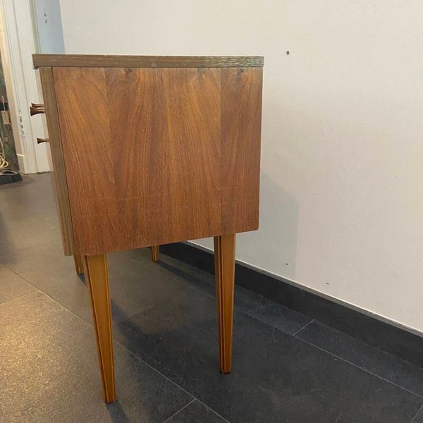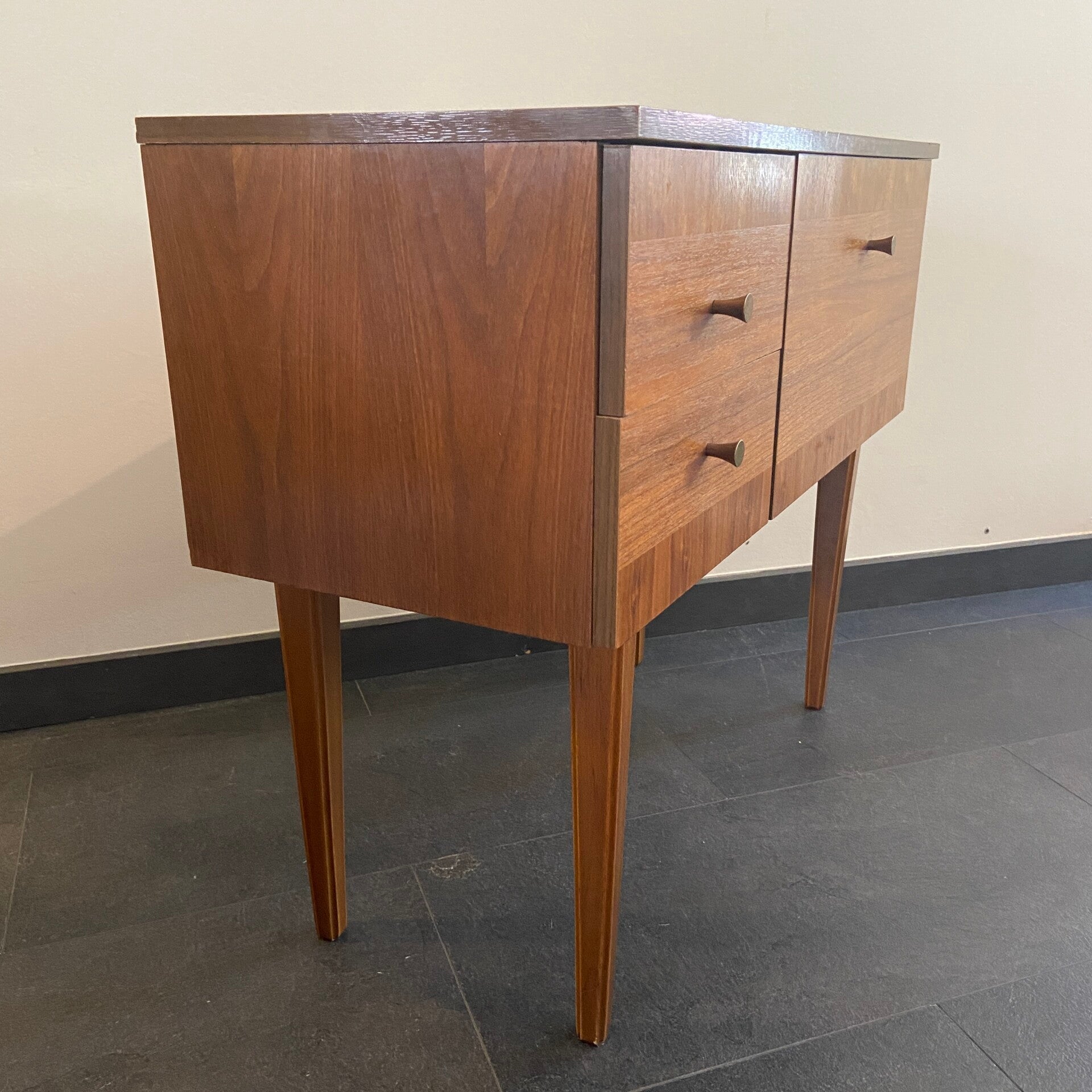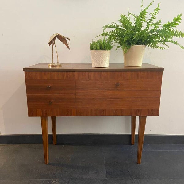 Elegant mini-dressoir van teakfineer met 2 laden en een klepkast. Bijzonder aan het kastje is het gebruik van ingelegd fineer op de fronten van de laden en klep, waardoor er een combinatie ontstaat van zowel horizontaal als verticaal fineer. De laden en klep hebben een subtiel messing handgreepje. De kast staat op taps toelopende poten. De conditie van de kast is goed; slechts een paar kleine gebruikssporen in de vorm van wat oppervlakkige krasjes op het blad en langs de rand en rechts aan de rand van het bovenblad is een kleine fineerschade aanwezig. Zie de detailfoto's die onderdeel zijn van de beschrijving.