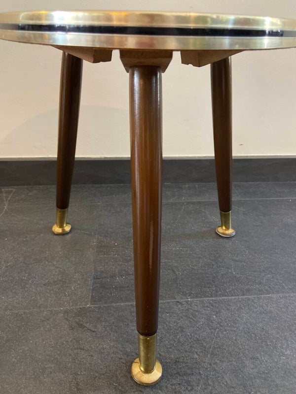 Een pareltje deze Duitse bijzettafel (jaren '60) De tafel heeft een glazen blad en is gedecoreerd met goudkleurige bladeren op een roomwitte ondergrond en afgezet met een zwarte rand. Rondom heeft het blad een messingkleurige band en de sluitstrip die vaak ontbreekt, is hier nog aanwezig! De band is hier en daar wat verweerd door de tijd maar nog erg mooi. De poten hebben een messing sok en stelvoet en kunnen eraf voor vervoer. De tafel verkeert in een buitengewoon mooie vintage staat, zoals op de foto's is te zien.