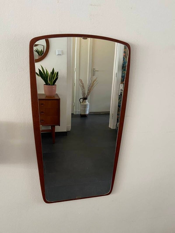 Mooi gevormde spiegel op een stevige teakhouten plaat. De spiegel verkeert in mooie vintage staat met wat kleine verweerde plekjes bovenaan de spiegel; zie hiervoor de detailfoto's.