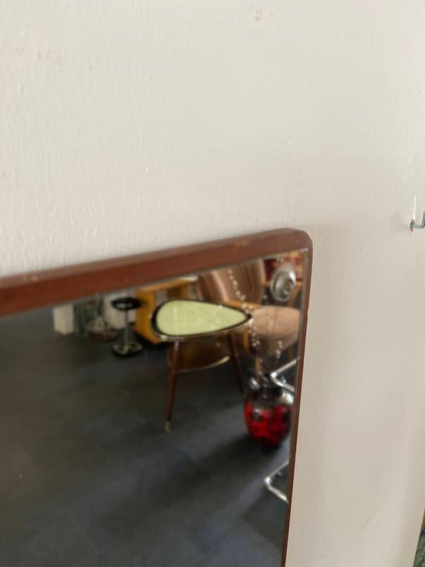 Mooie vintage spiegel op stevige teakhouten plaat. De spiegel heeft een strakke uitstraling en 4 metalen sierdopjes. De staat van de spiegel is goed met wat minimale gebruikssporen; zie hiervoor de foto's.