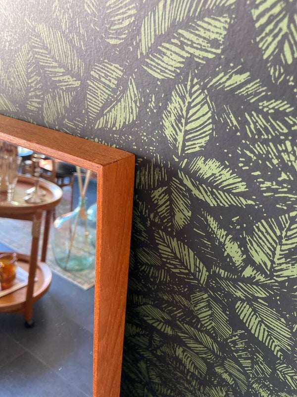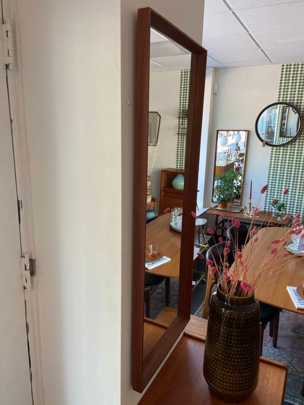 Zeer mooie, strak vormgegeven vintage spiegel in een teakhouten lijst. Spiegel en lijst verkeren in goede staat; minimale sporen van gebruik langs de randen van de lijst zijn aanwezig, passend bij de leeftijd (jaren '60).