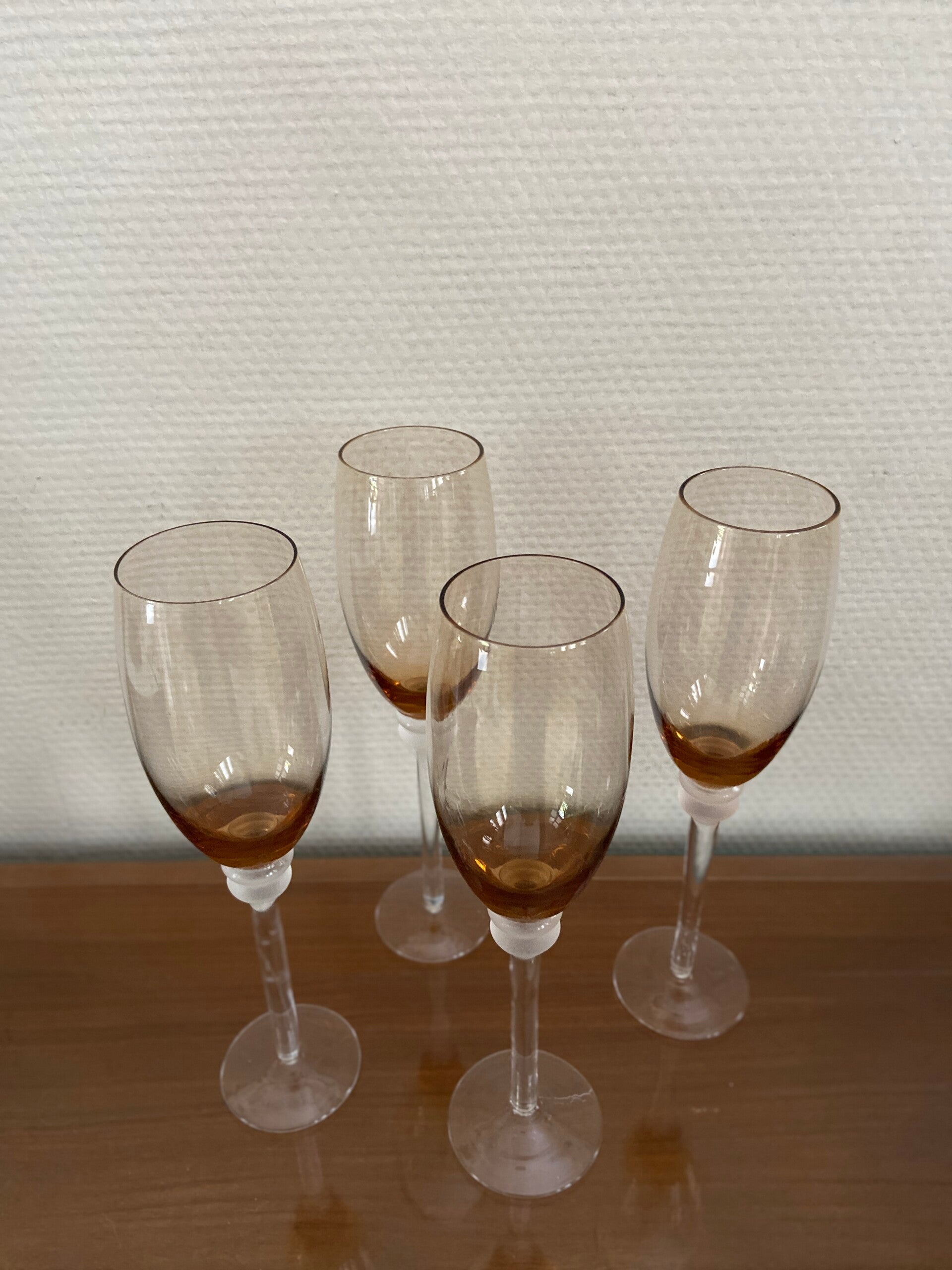 Set van 4 vintage Franse champagneflûtes met amberkleurige kelk