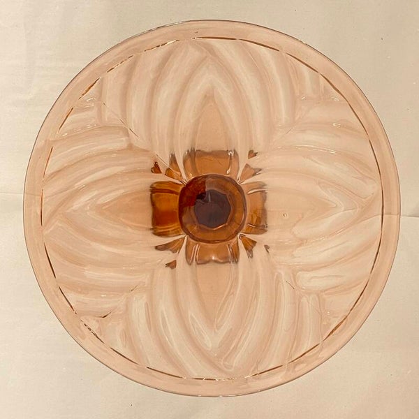 Zeer mooie, bewerkte taartschaal van oudroze persglas. De schaal verkeert in goede vintage staat; geen chips of barstjes. Oppervlakkige gebruikssporen, passend bij de leeftijd zijn aanwezig.