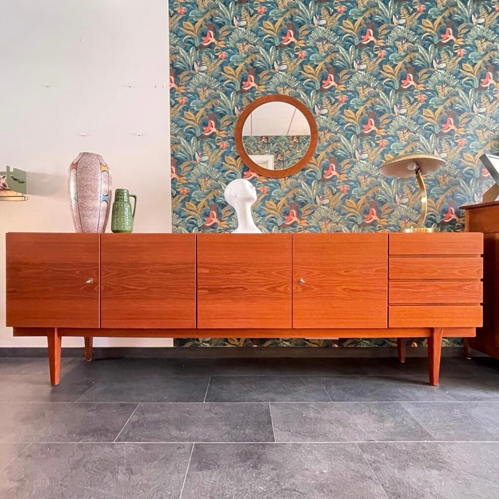 Geweldig mooi dressoir van teakhout in topstaat! Dit dressoir is volledig gerestaureerd en kan weer vele jaren mee! Met maar liefst 4 deuren met daarachter 2 kasten met planken en 4 laden, biedt deze kast enorm veel opbergruimte. De originele sleutels zijn aanwezig en werken goed. Let op de mooie houtstructuur van de deuren en het strak vormgegeven onderstel met de taps toelopende poten. De kast heeft geen krassen, verkleuringen of beschadigingen De bovenste lade heeft wat minimale gebruikssporen, zoals op de foto is te zien.