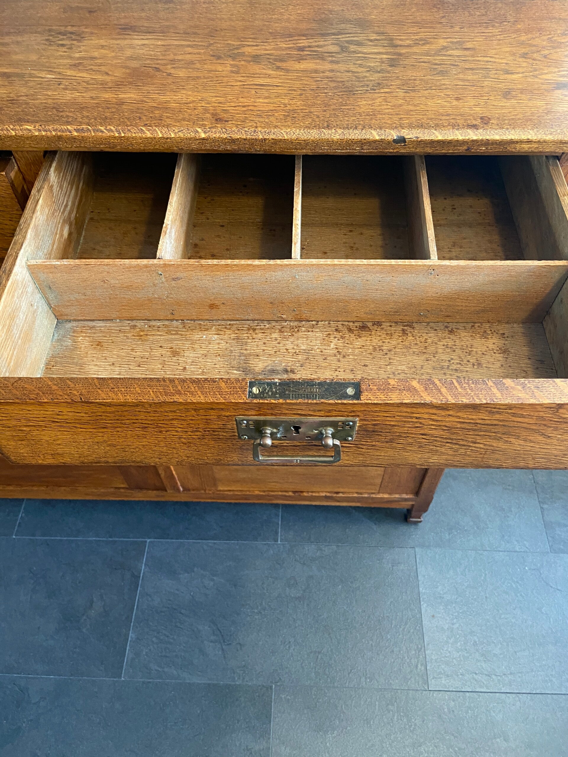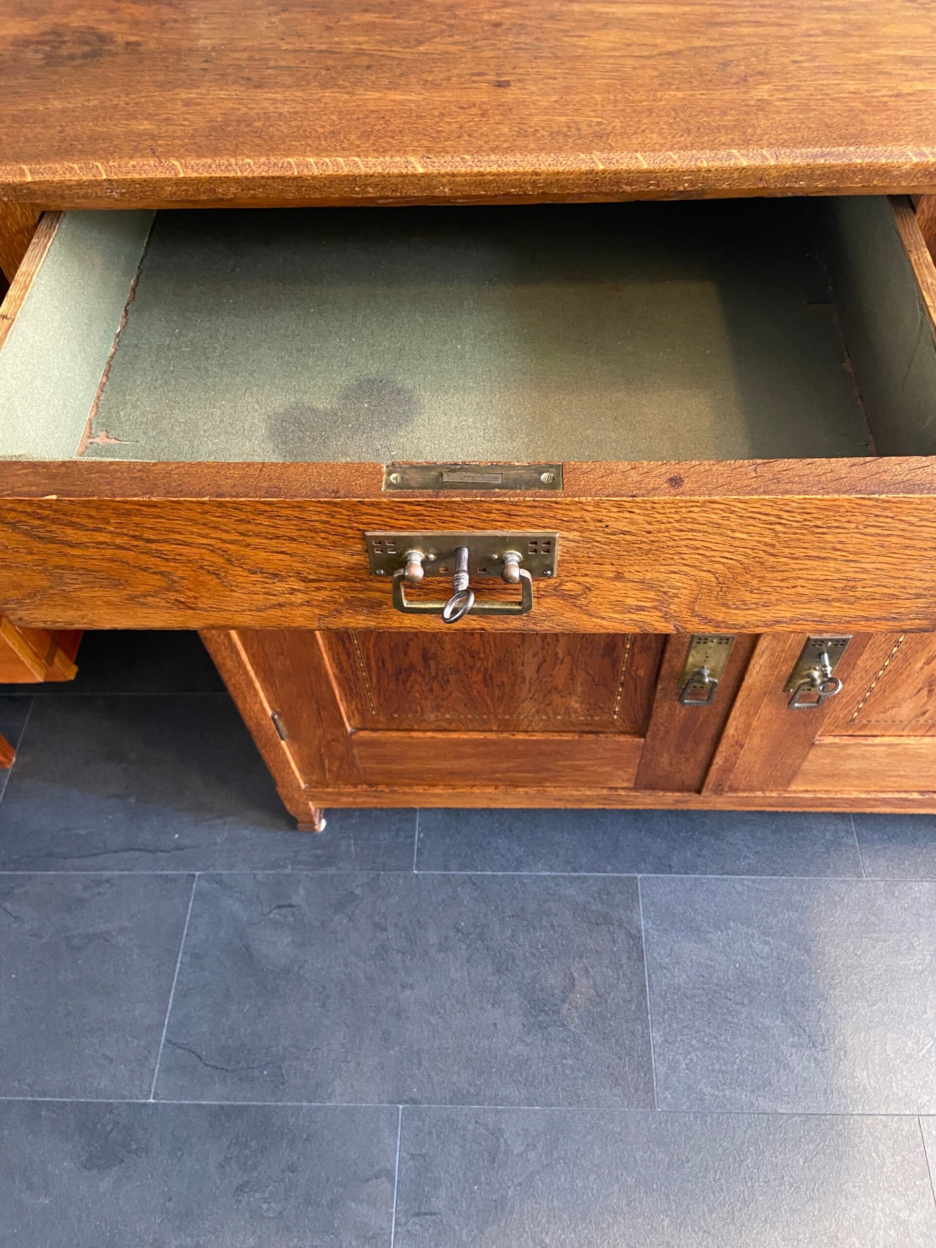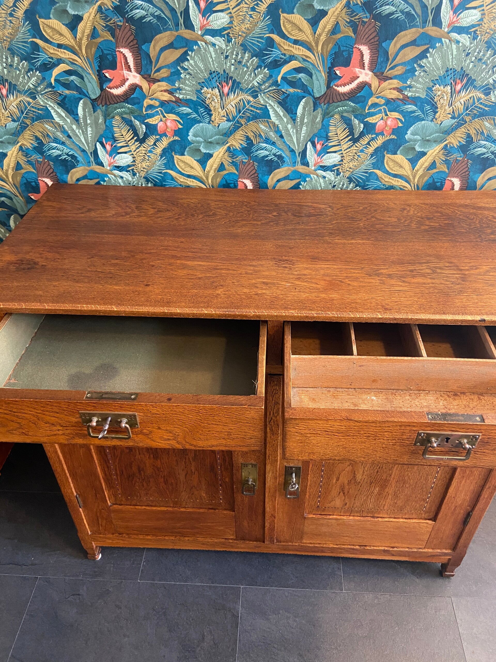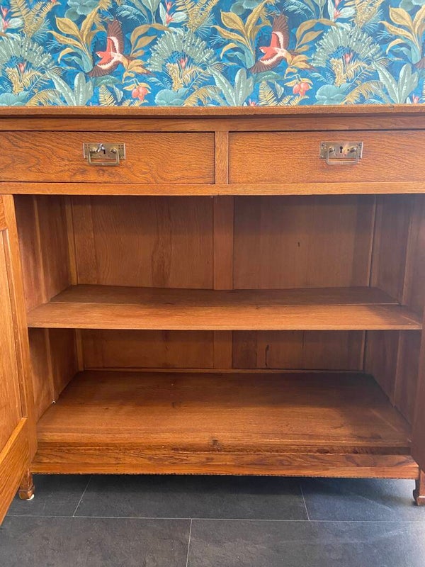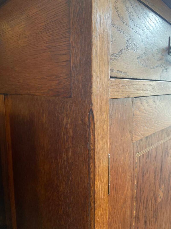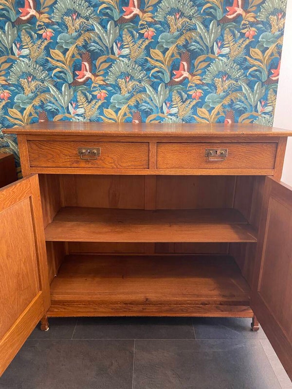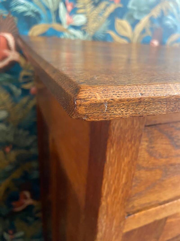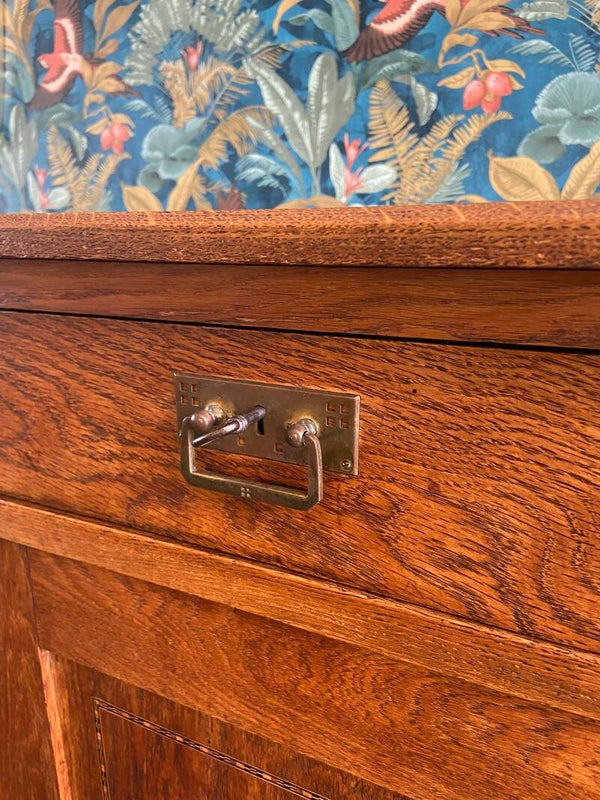 Zeer mooie, strakke eikenhouten commode met sierlijke details zoals het ingelegde hout in de deuren en het messing beslag. De commode heeft 2 laden en 2 deuren met daarachter een kastruimte die verdeeld wordt in 2 delen. De kast biedt veel opbergruimte! Door zijn hoogte is de kast bruikbaar als commode in de kinderkamer voor de langere ouders onder ons, maar staat natuurlijk ook geweldig in de woonkamer of slaapkamer. De kast verkeert in mooie vintage staat met minimale gebruikssporen aan de randen van het blad; zoals op de foto's te zien is. De laden hebben gebruikssporen en stoffen bekleding van de rechterlade is verweerd en kan vervangen worden door een zelf gekozen patroon kastpapier o.i.d.