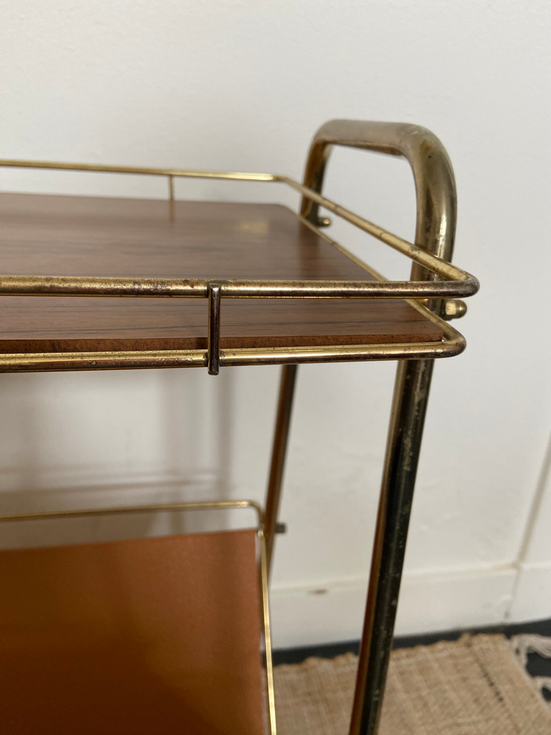 Wat een leuk bijzettafeltje is dit! Handig te verplaatsen door de wieltjes die eronder zitten. De tafel heeft een gefineerd tafelblad en messing frame met een lectuurhouder van terrakleurig kunstleder (skai). Zowel tafelblad als lectuurhouder verkeren in goede staat, zoals te zien is op de foto's. Het frame heeft op het messing gebruikssporen passend bij de leeftijd.