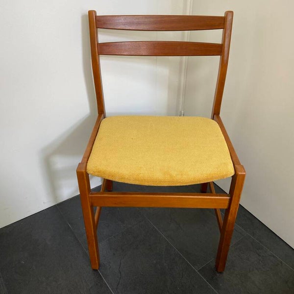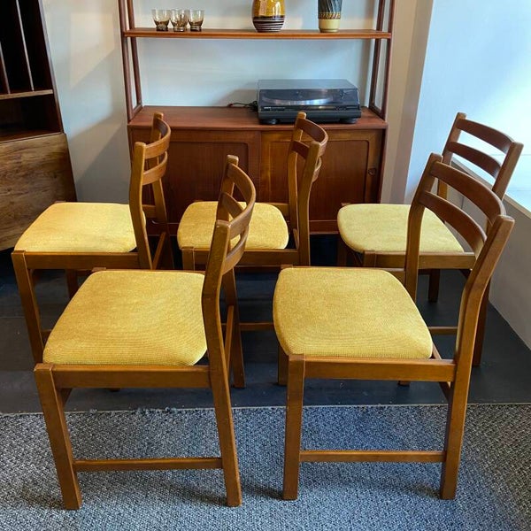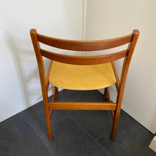 Set van 5 vintage eetkamerstoelen van Kurt Ostervig voor K.P. Mobler, Denemarken, jaren '60. De stoelen hebben een houten teakkleurig frame en nieuw schuim in de zitting. De stoelen zijn opnieuw gestoffeerd met een frisse ribcord stof in maisgeel; hetgeen prachtig combineert met het hout. De set verkeert in goede staat; minimale gebruikssporen op poten of leuningen zijn hier en daar aanwezig.