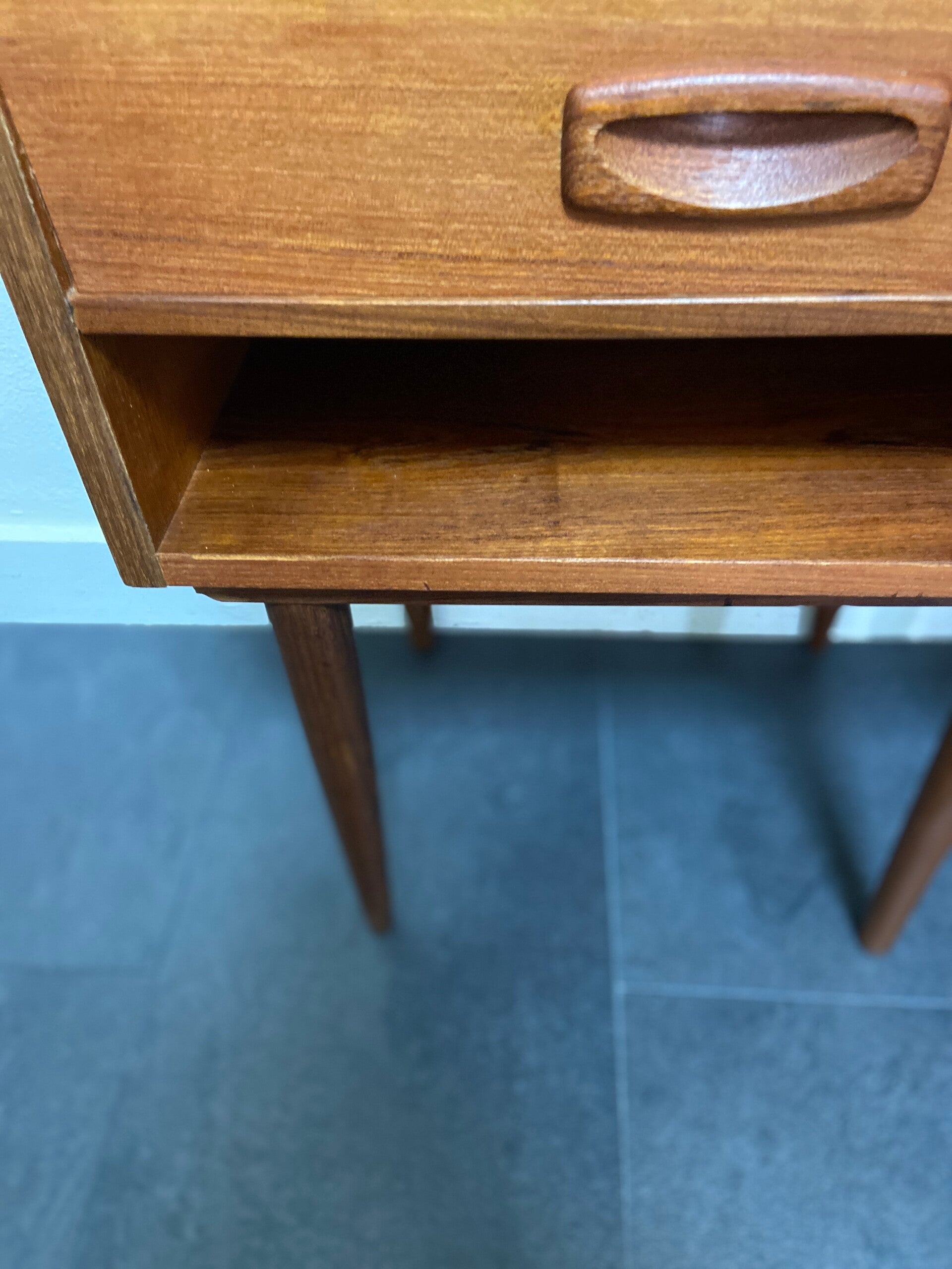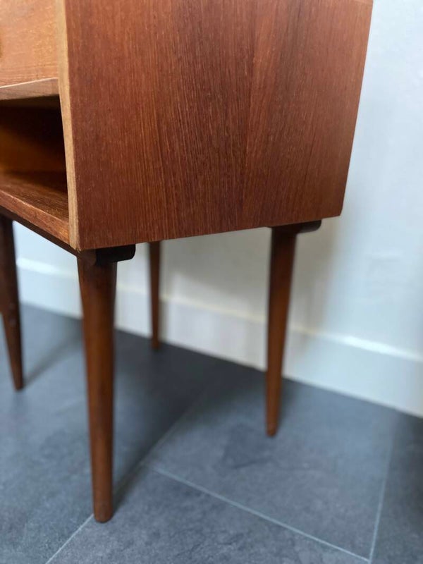 Bijzonder mooie, strakke vintage set nachtkastjes van teakfineer. De kastjes hebben een lade en een open vak; genoeg ruimte dus om je spullen op te bergen. De kastjes zijn zeer stijlvol door de mooie handgrepen en de hoge conische poten. De set verkeert in een zeer goede staat en zijn waar nodig vakkundig gerestaureerd. Wat kleine gebruikssporen blijven aanwezig, passend bij de leeftijd. Een van de kastjes heeft een verkleuring in het open vak, zoals op de foto te zien is.