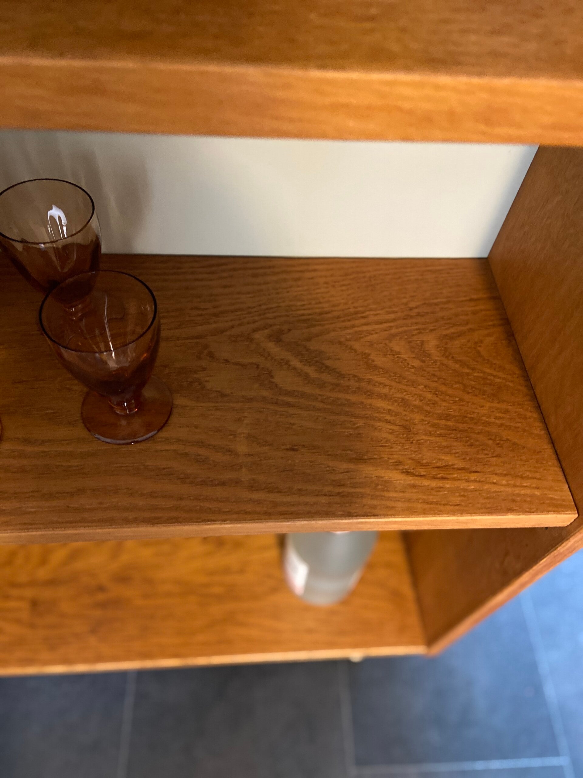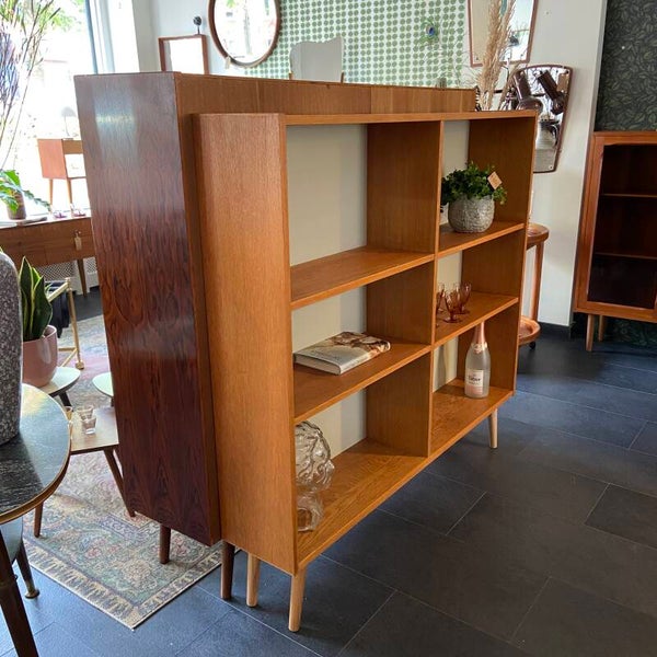 Superhandige, strak vormgegeven vintage Deense kast van Domino Møbler! De kast biedt veel ruimte voor je boeken, verzameling en alle spullen die je bij de hand wilt hebben. De achterwand is gemaakt van lichtgrijs hardboard, dat mooi contrasteert met het warme teakhout. De kast verkeert in goede vintage staat met hier en daar wat oppervlakkige gebruikssporen op de planken.