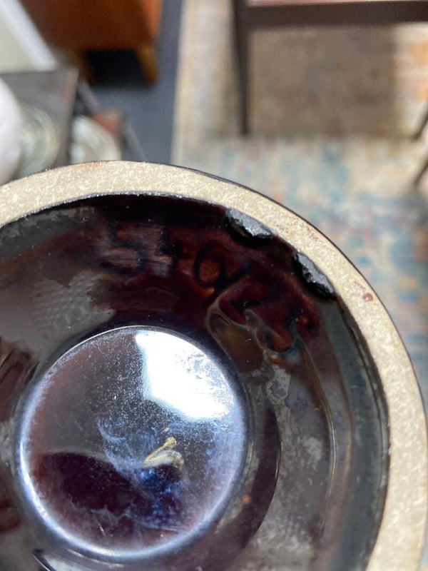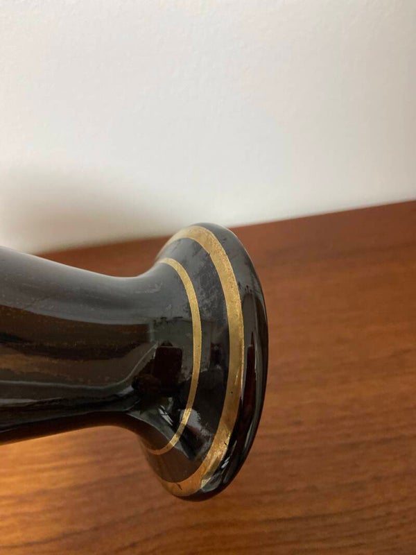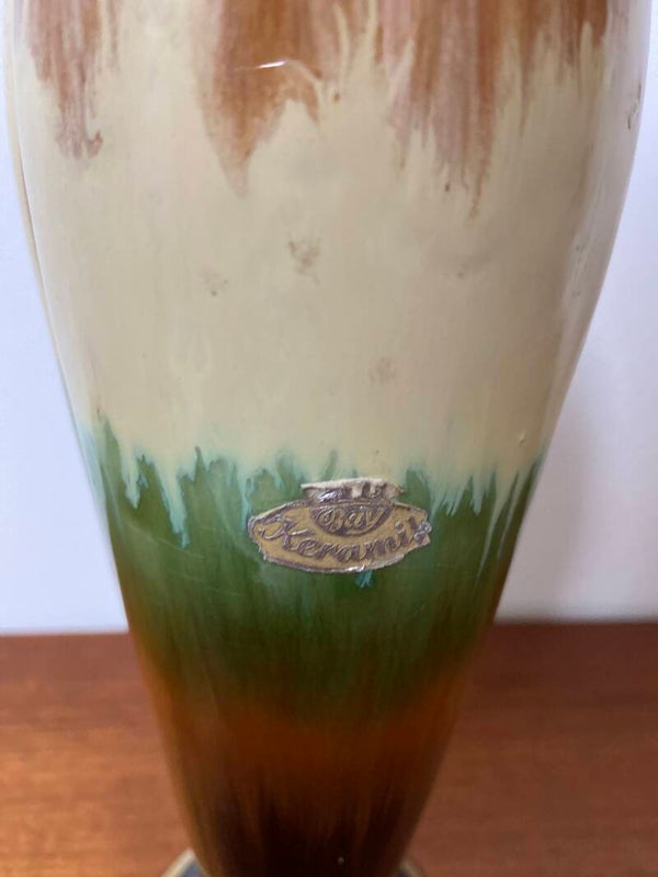 Buitengewoon mooie vaas Bay Keramik! De vaas is uitgevoerd in een tulpvorm in de natuurlijke kleuren karamel, roomwit, groen en bruin. Aan de bovenrand en voet is de vaas afgewerkt met een subtiele gouden rand. De vaas verkeert in goede staat.