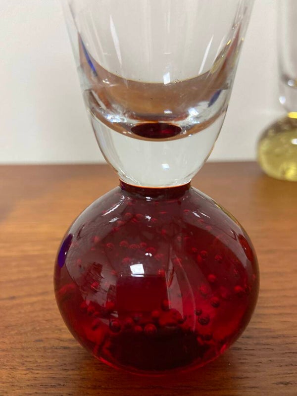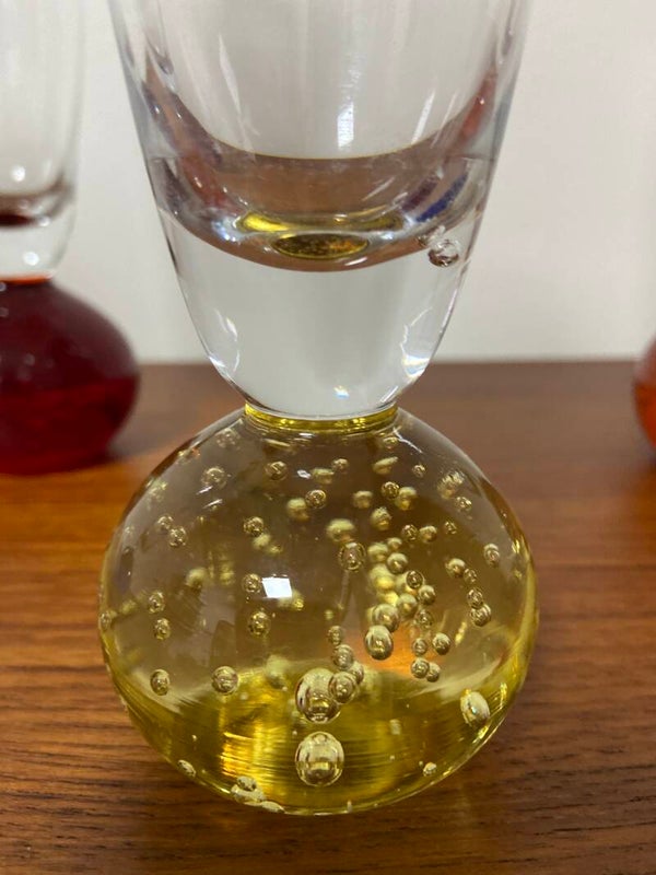 Geweldige set van 4 Franse hoge glazen op een gekleurde bolvormige voet. Er zijn veel aanwijzingen om aan te nemen dat het gaat om handgemaakte glazen. Bijzonder mooi is het detail van de luchtbelletjes in de glazen bolvoet. De set verkeert in goede staat.
