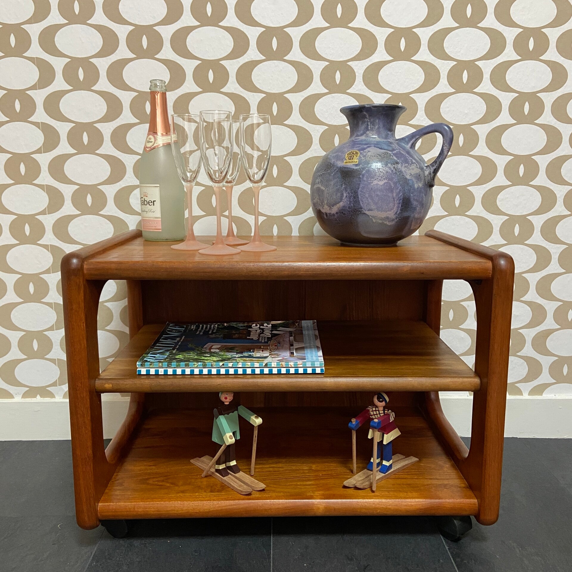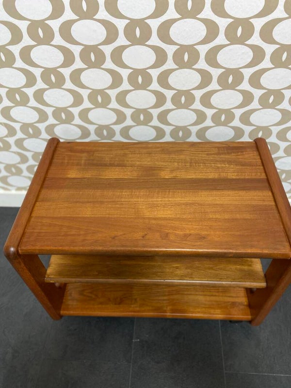 Een mooi staaltje Deens vakwerk van Toften Møbel! eze kast is gemaakt van teakhout en kenmerkt zich door de mooie vormgeving met afgeronde hoeken. De kast staat op 4 wielen en is dus makkelijk verplaatsbaar. Handig voor de TV of platenspeler, maar ook als bijzettafel erg leuk. De achterkant is ook van teakhout en zeer mooi, dus de kast kan ook los worden geplaatst! In zeer goede staat, met een lichte verkleuring op de onderste plank waar in het verleden waarschijnlijk nog een staande plank aanwezig was. Het meubel is aan de onderkant gemerkt met: 'Toften Møbelfabrikken, Denmark'.
