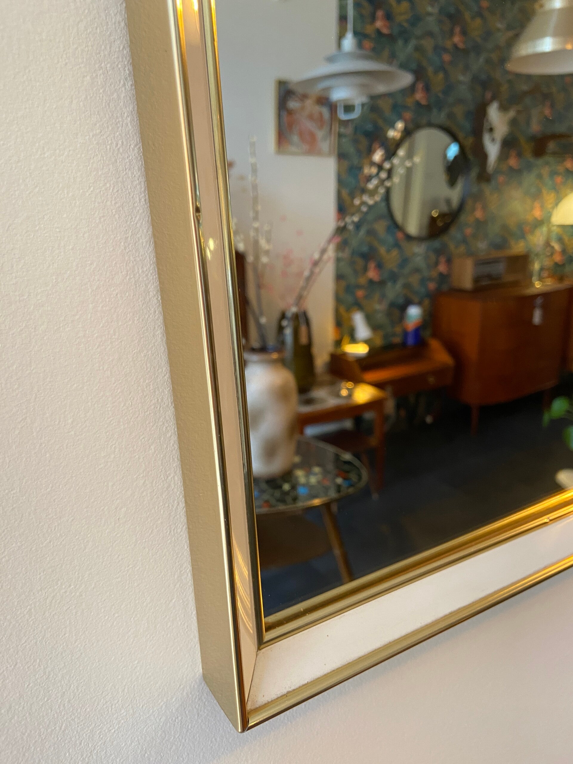 Strakke vintage messing spiegel met een witte rand. De spiegel verkeert in mooie staat met wat gebruikssporen op de lijst.