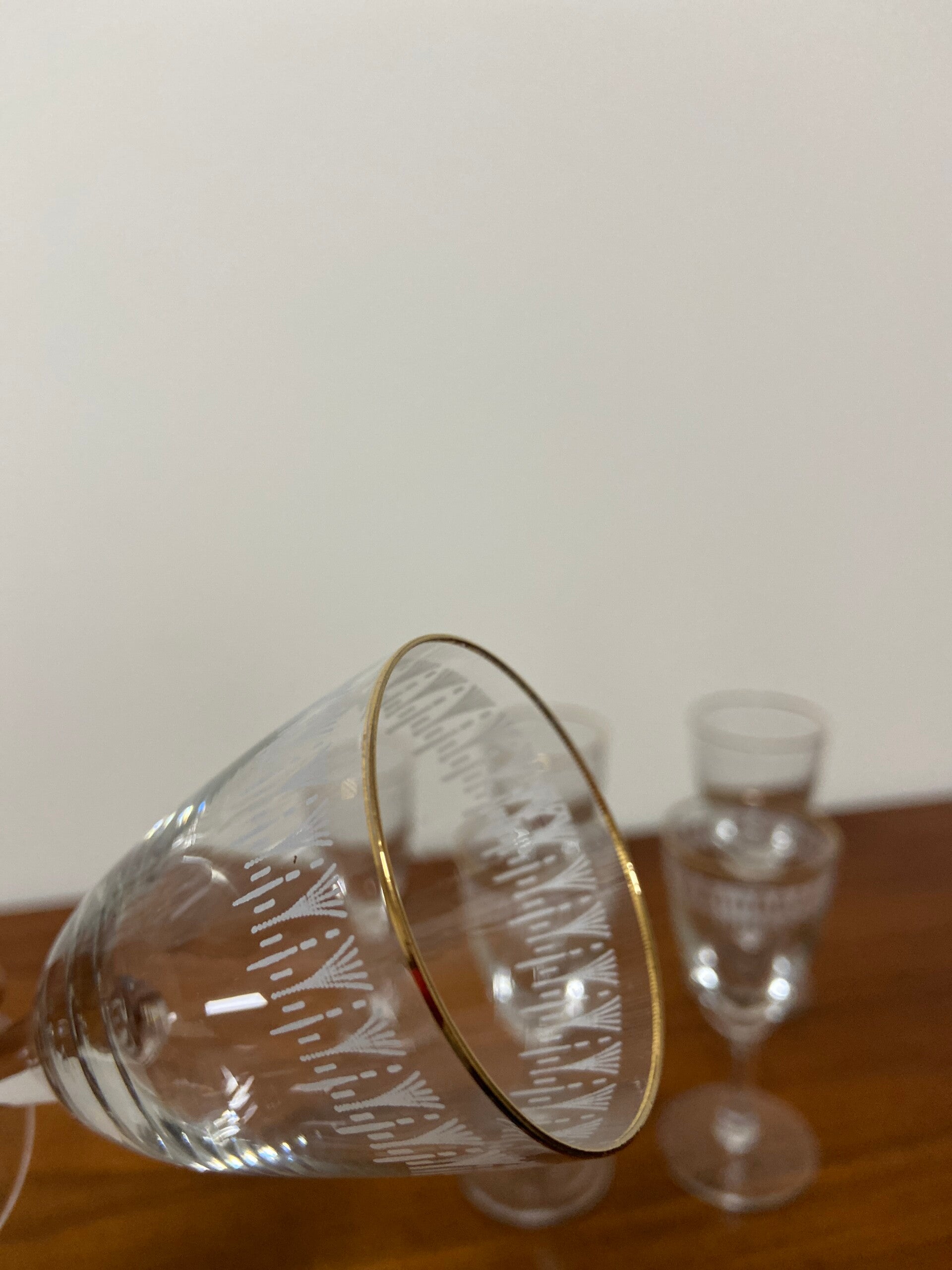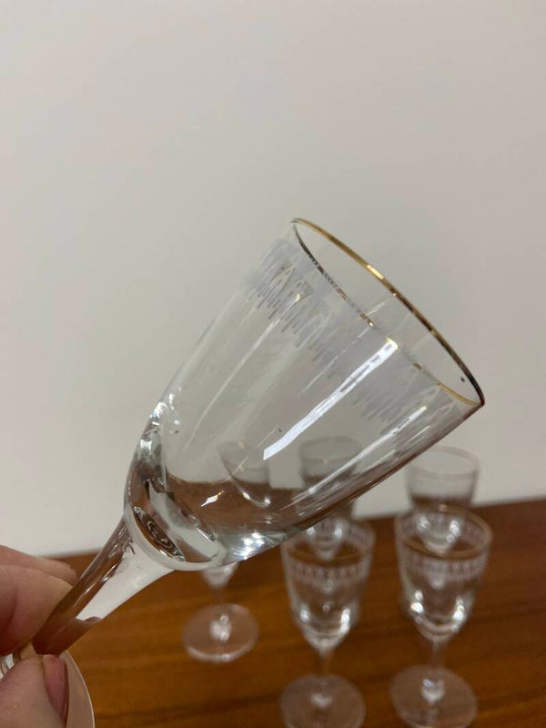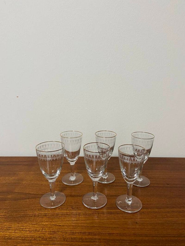 Feestelijke set van 6 verfijnde, chique likeurglazen met een gouden rand en witte decoratieve band. De glazen verkeren in goede staat.