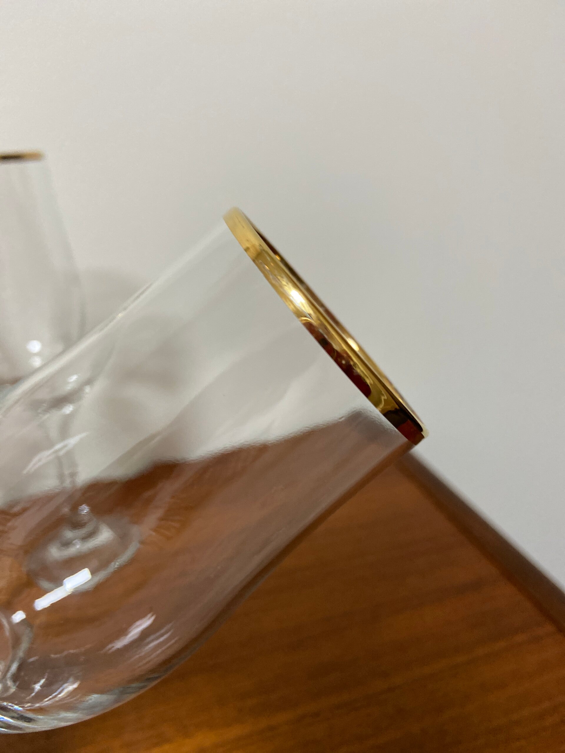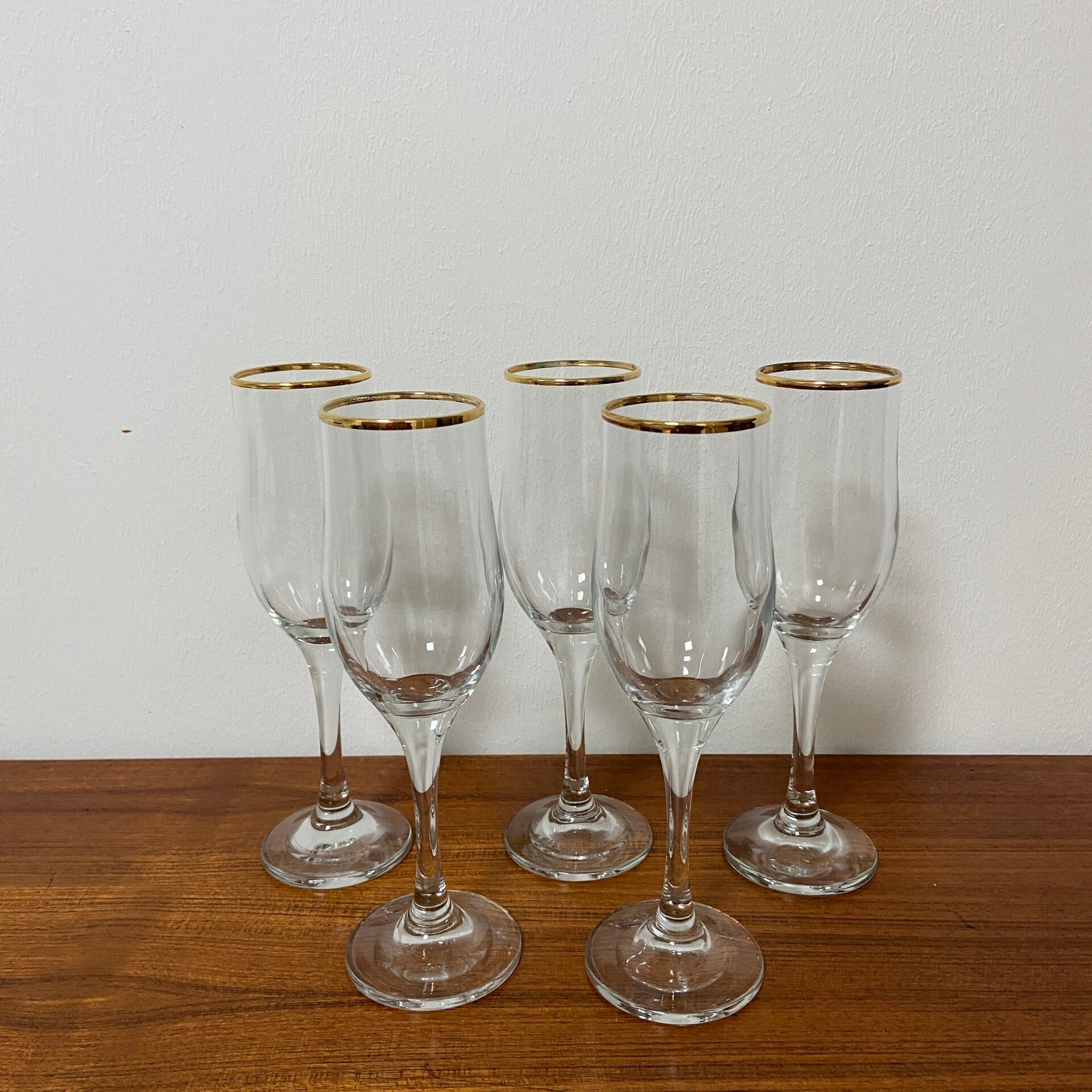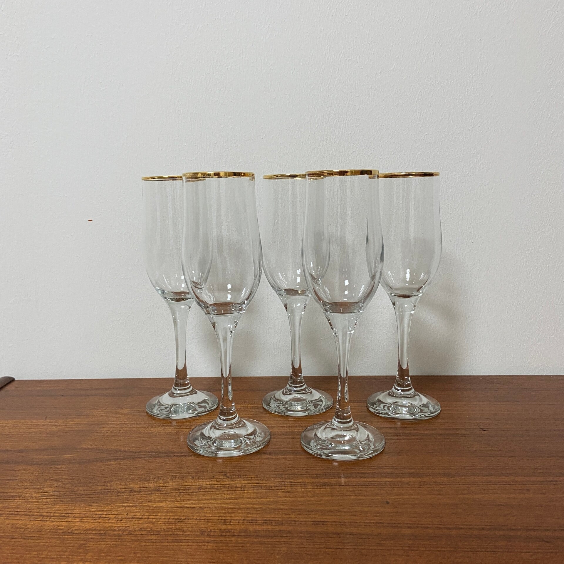 Bijzondere set van 5 vintage flûtes met gouden rand. De glazen zijn gemaakt van vrij dik glas met robuuste voet, waardoor de glazen zwaar zijn en niet zo kwetsbaar.