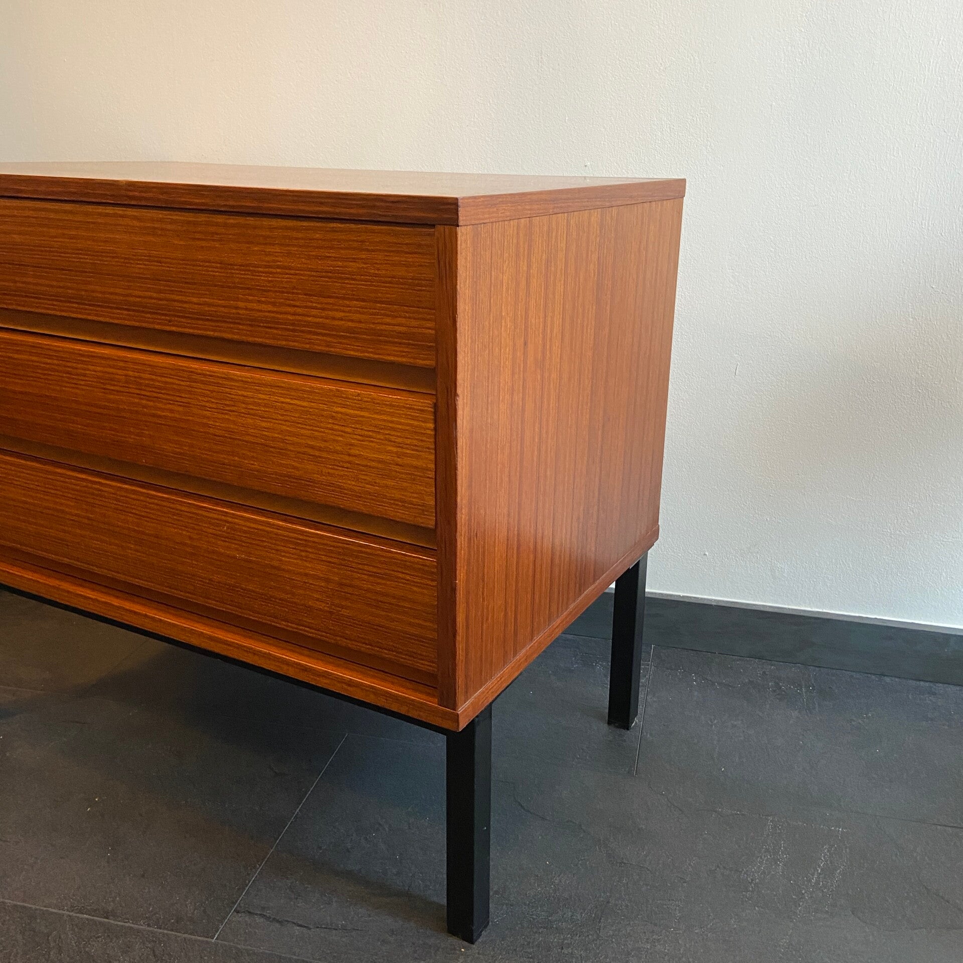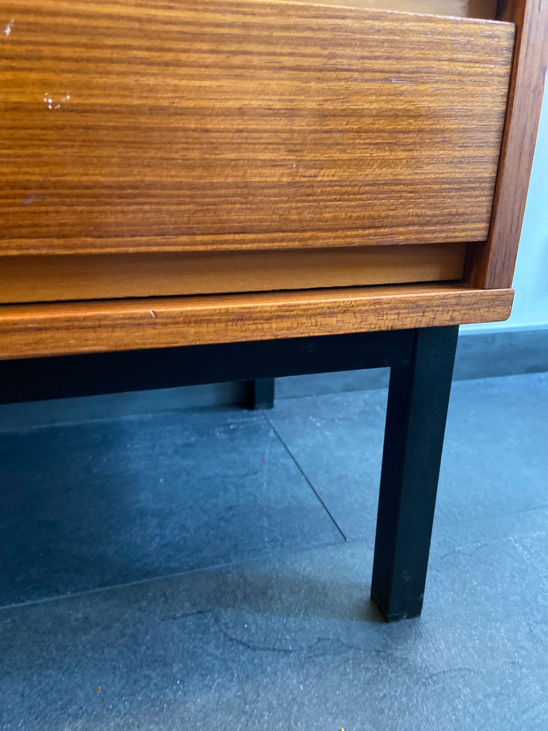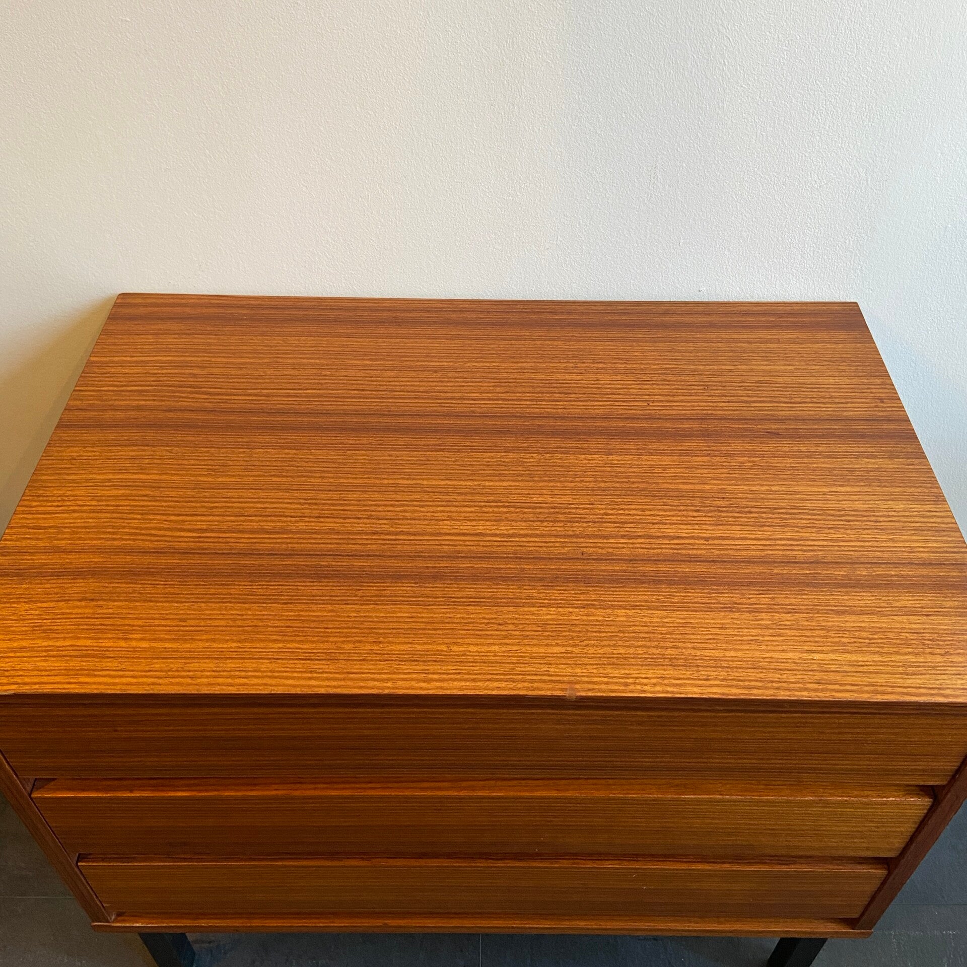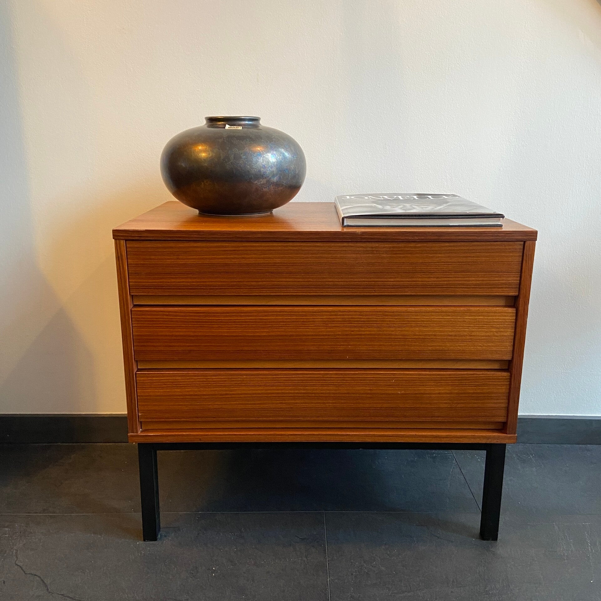 Strakke ladekast van warm teakfineer op zwart metalen poten; een tijdloze combinatie van materialen! De kast heeft 3 laden en biedt dus veel opbergruimte. De kast verkeert in mooie staat met wat kleine gebruikssporen; aan de bovenrand is een reparatie met was uitgevoerd en wat kleine plekjes hier en daar. Zie de foto's die een goed beeld geven van deze mooie kast.