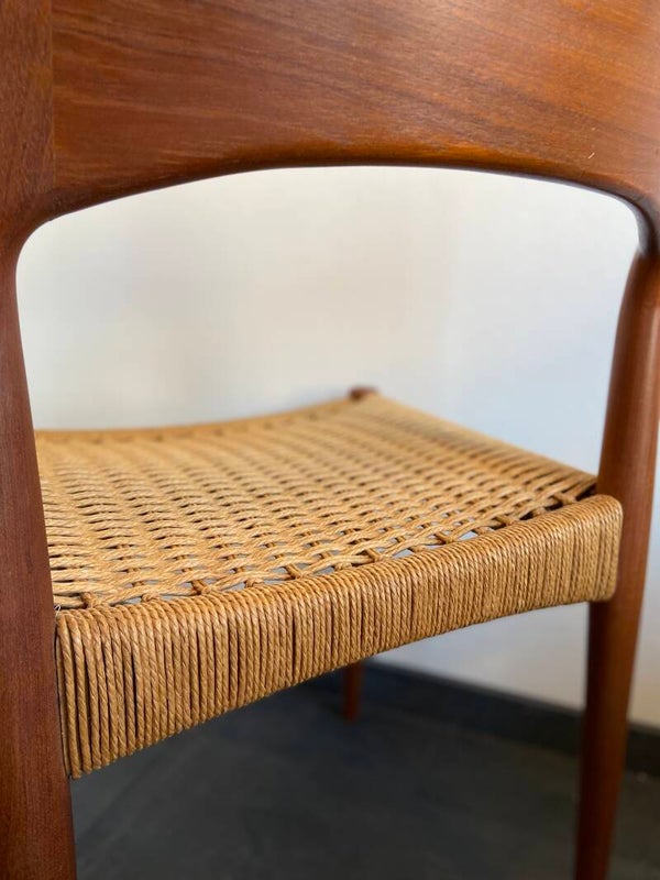 Geweldige set van 4 vintage design stoelen met papercord van de Deense ontwerper Arne Hovmand Olsen. De bekleding is origineel en verkeert in goede staat. Het frame is gemaakt van teakhout en kenmerkt zich door de sierlijke, organische vormgeving.