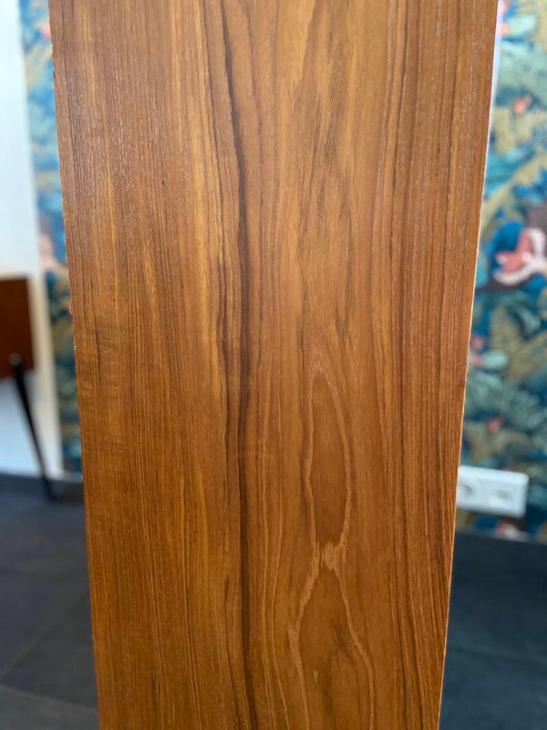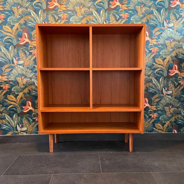 Bijzonder mooi boekenkastje met een bijzondere indeling. De kast heeft 5 vakken waardoor je, je spullen georganiseerd kunt opbergen. De bovenste 2 planken zijn in hoogte verstelbaar. De kast is uitgevoerd in warm teakfineer verkeert in mooie staat met wat kleine gebruikssporen. Boven op het blad (midden) is een kleine beschadiging gevuld met was en aan de linker zijkant, onderaan is een reparatie met was uitgevoerd. Zie de detailfoto's om een goed beeld te krijgen.