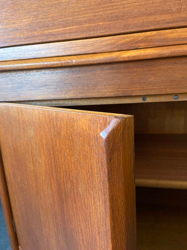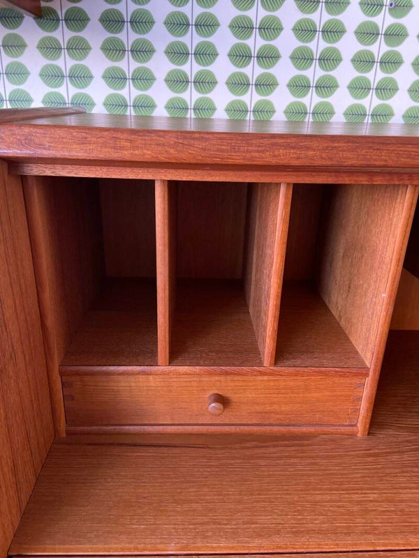 Zeer mooie Deense secretaire met veel opbergruimte. De kast heeft bovenin 3 laden en vakken. Onderin een kast met plank voor het overzichtelijk opbergen van je spullen. De kast verkeert in mooie vintage staat met minimale gebruikssporen. Aan de binnenkant van de klep (het schrijfgedeelte) een paar kleine deukjes (zie detailfoto's) en bij het sleutelgedeelte een plekje.