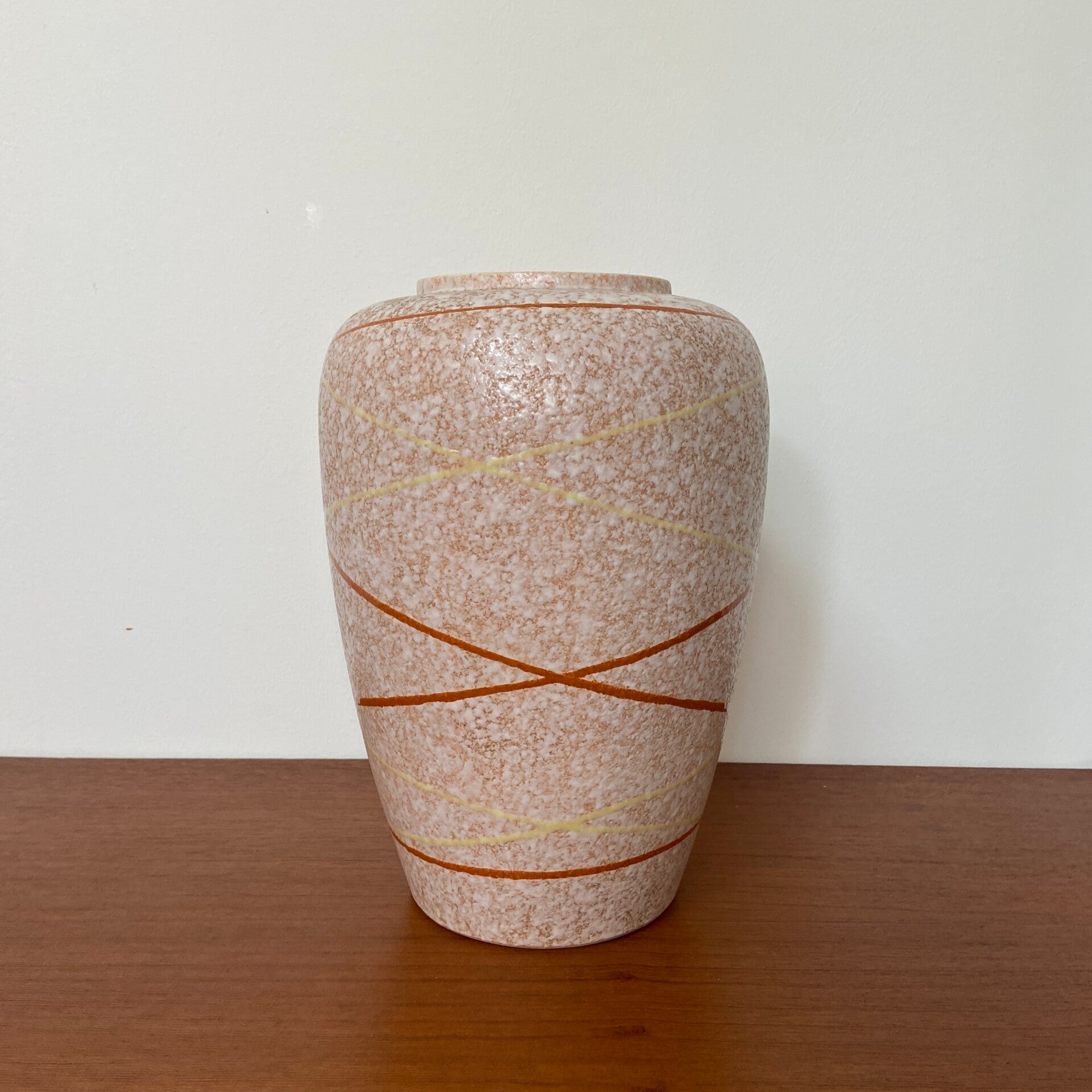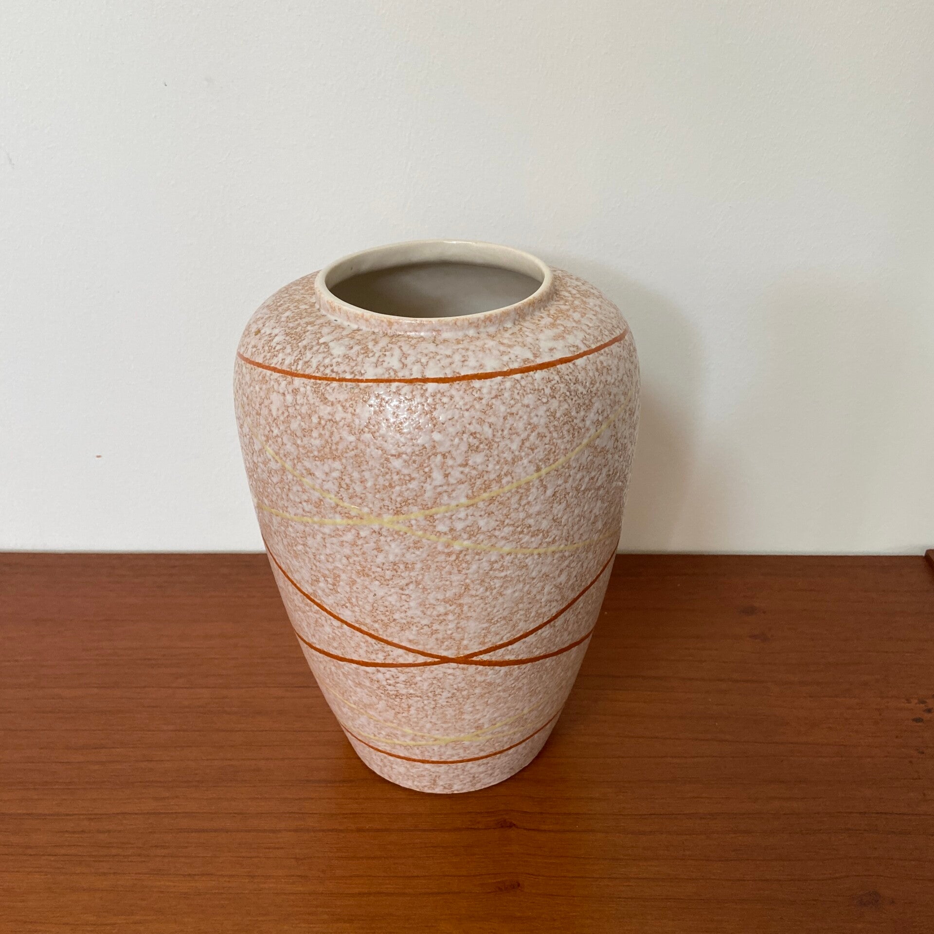 Zeer mooie vaas in gemeleerd terra/wit uitvoering met subtiele oranje en lichtgele strepen. De vaas is gemerkt met 'Foreign' wat aangeeft dat de vaas naar het buitenland is geëxporteerd destijds. De conditie is goed.