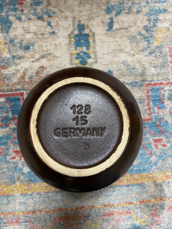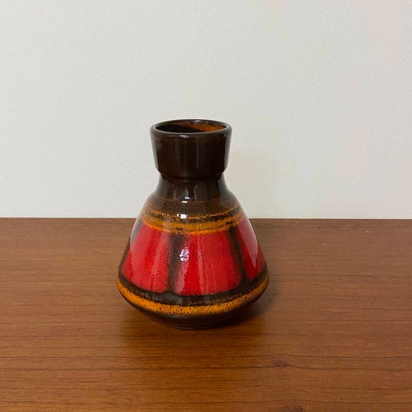 Prachtige vormgegeven vaas van klein formaat van Dümler en Breiden. Uitgevoerd in donkerbruin geglazuurd aardewerk met decoratieve vlakken in rood en oranje.