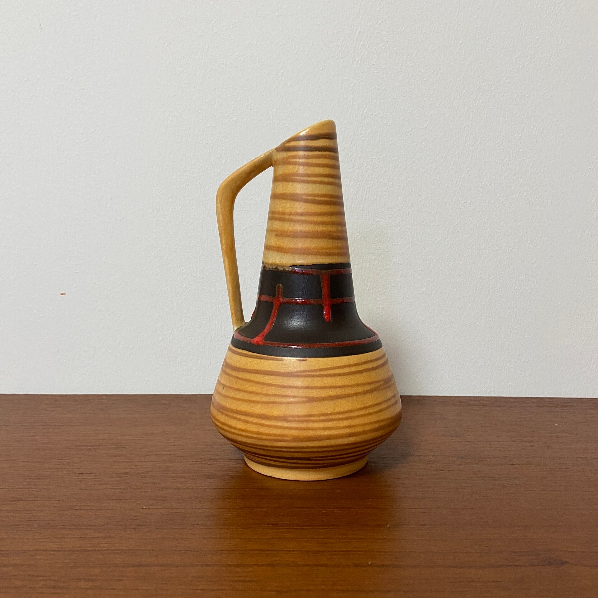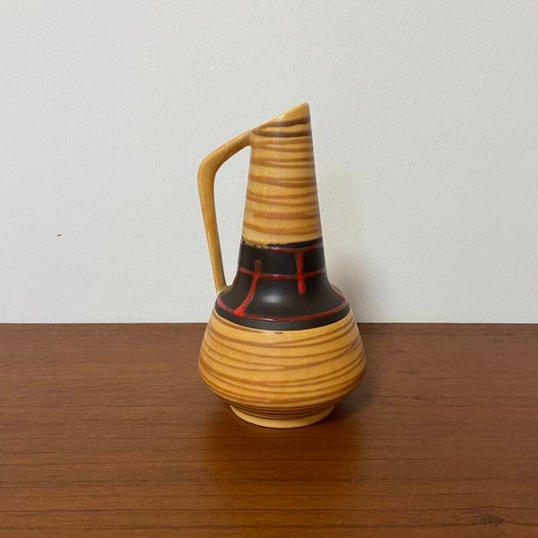 Zeer mooi vormgegeven vaasje in honingkleur/geel met een bruin vlak en rode fat lava decoratie. Jaren '50/'60. De vaas verkeert in goede staat.