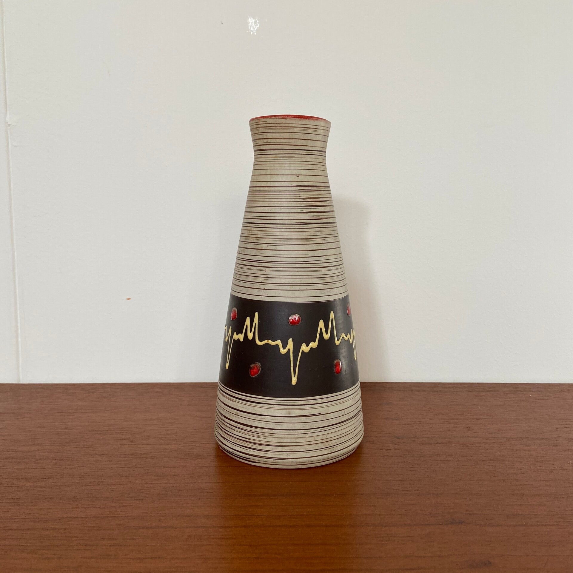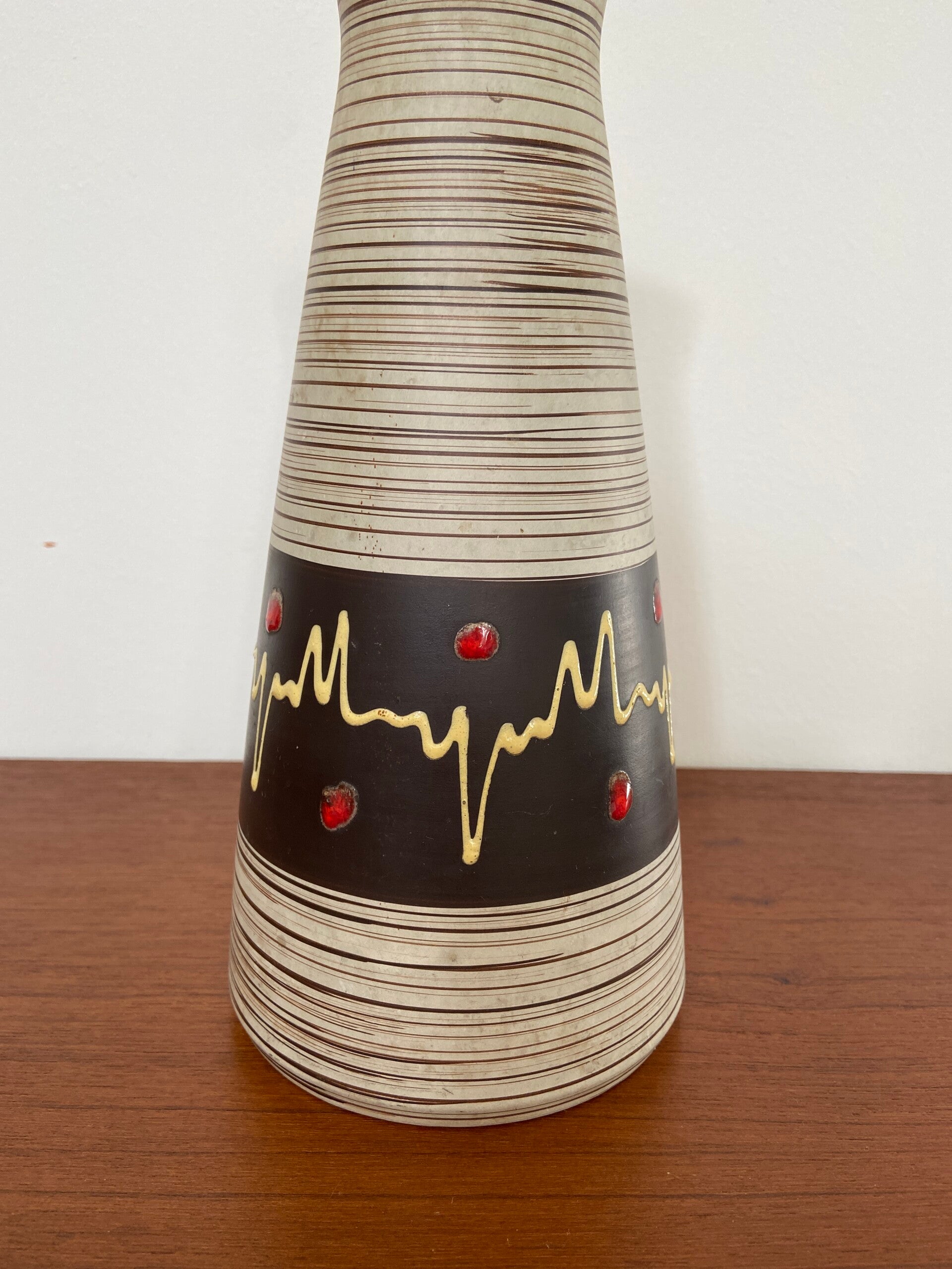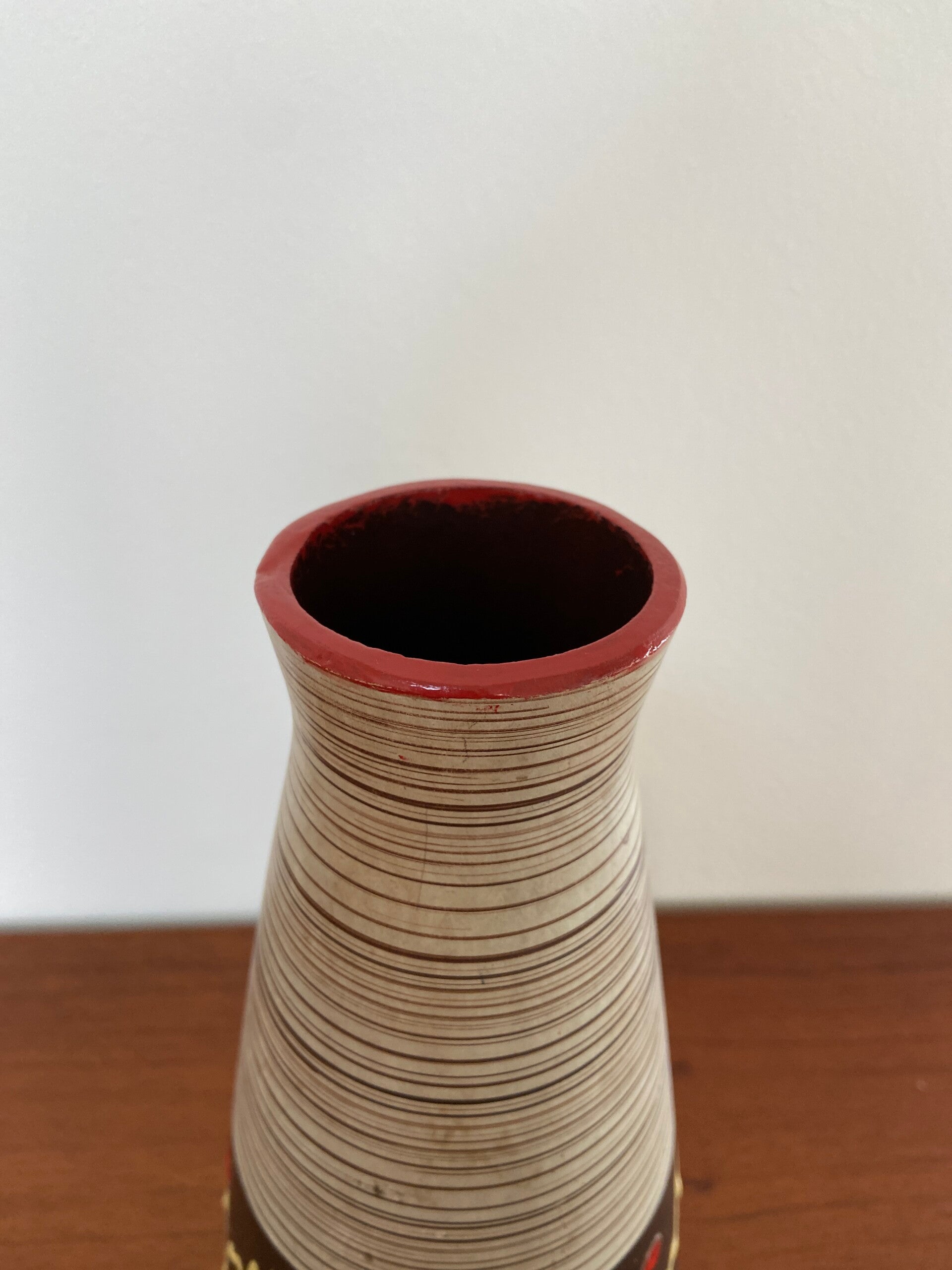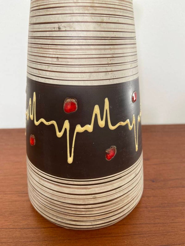 Bijzondere vaas in off-white aardewerk met ribbelstructuur en een bruine band met fat lava accenten in rood en zachtgeel.