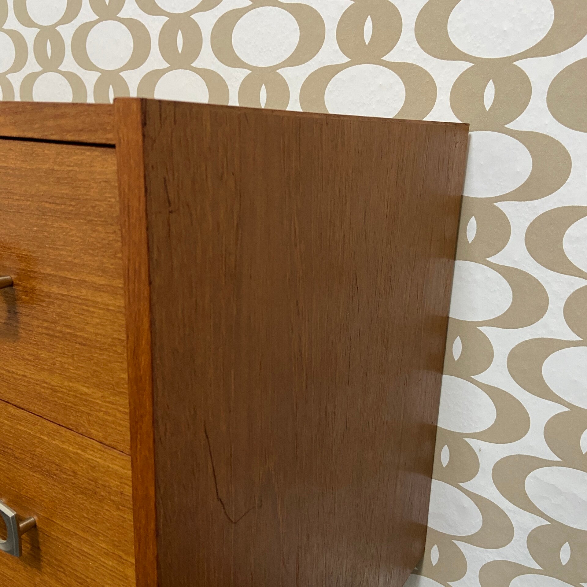 Deense ladekast met 3 flinke laden, dus veel opbergruimte! De kast is uitgevoerd in warm teakfineer en heeft leuke metalen handgrepen. De staat van de kast is goed met aan de rechterzijwand een paar oppervlakkige krasjes. Zie de foto's die een goed beeld geven.