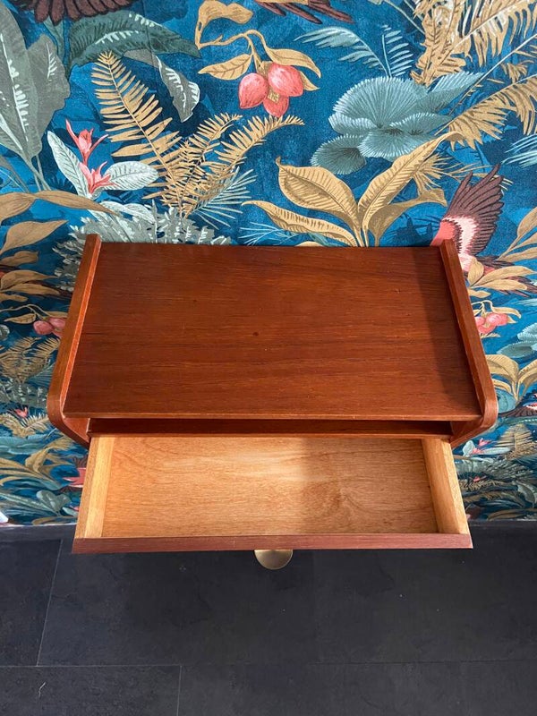 Prachtig zwevend kastje met lade uit Denemarken, van zware kwaliteit teakfineer. Het kastje heeft een royaal formaat zodat het voldoende ruimte heeft voor het opbergen van kleine spullen. Leuk als nachtkastje of als halkastje met een spiegel erboven! Het kastje verkeert in een zeer goede staat; zoals op de foto's is te zien en heeft een mooi gevormde handgreep van messing. Er zijn twee kastjes beschikbaar, de prijs is per stuk.