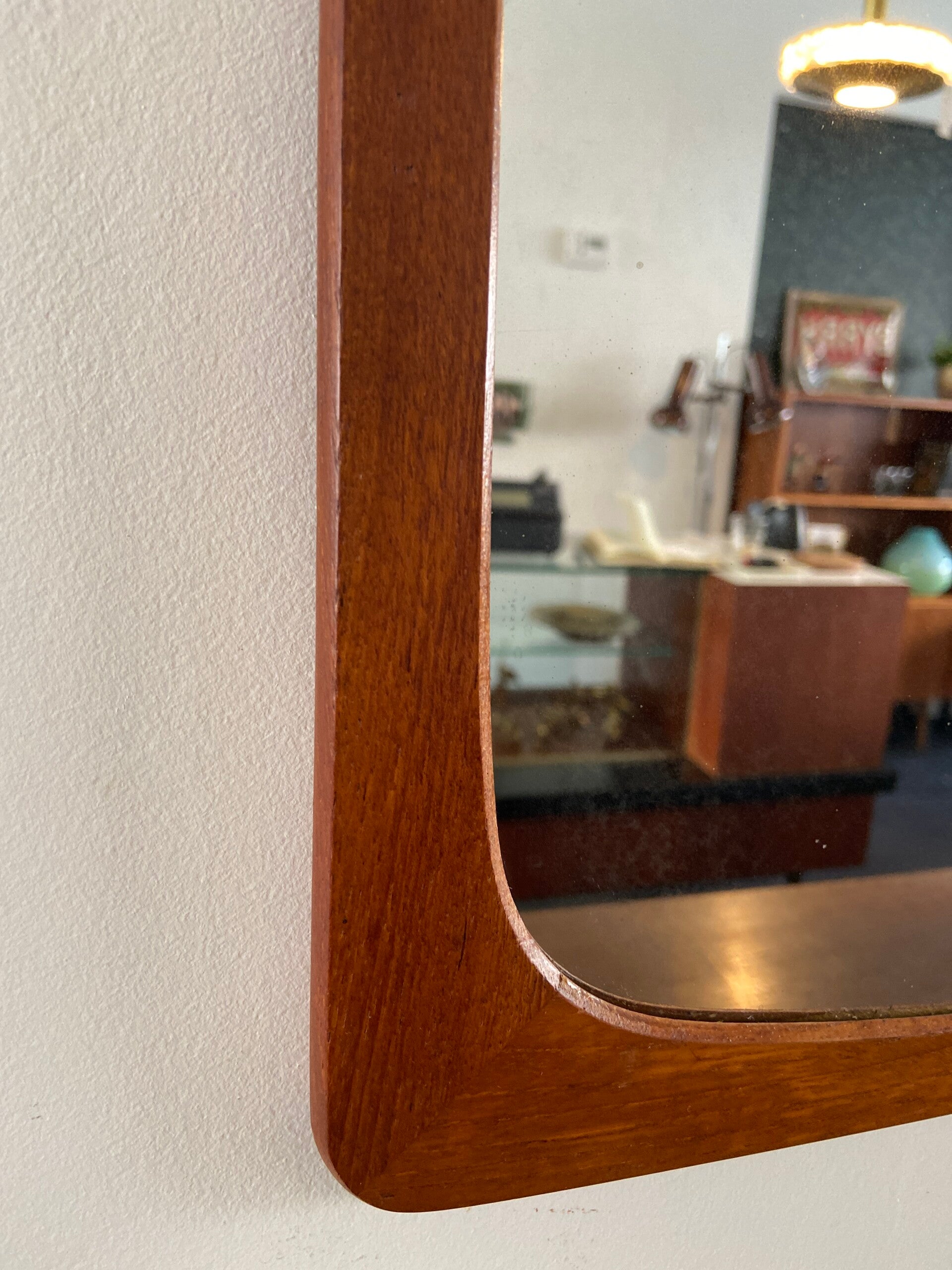Deze vintage spiegel zit in een prachtige teakhouten lijst met afgeronde hoeken. De lijst is in zeer goede staat, de spiegel zelf heeft onderaan aan weerskanten een licht 'wolkig' ouderdomseffect. Je kunt de spiegel vervangen, maar het geeft ook een mooie vintage look. In de prijs is rekening gehouden met deze ouderdomssporen.