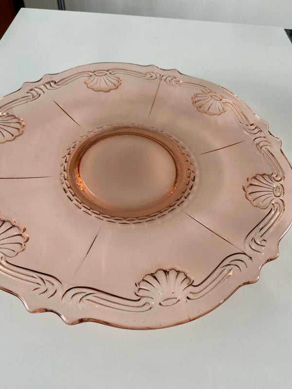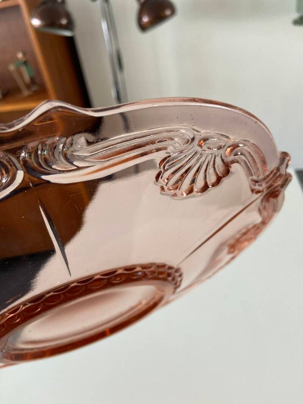 Zeer mooie, grote schaal van roze glas. De schaal heeft een sierlijke, geschulpte rand en verkeert in goede staat.