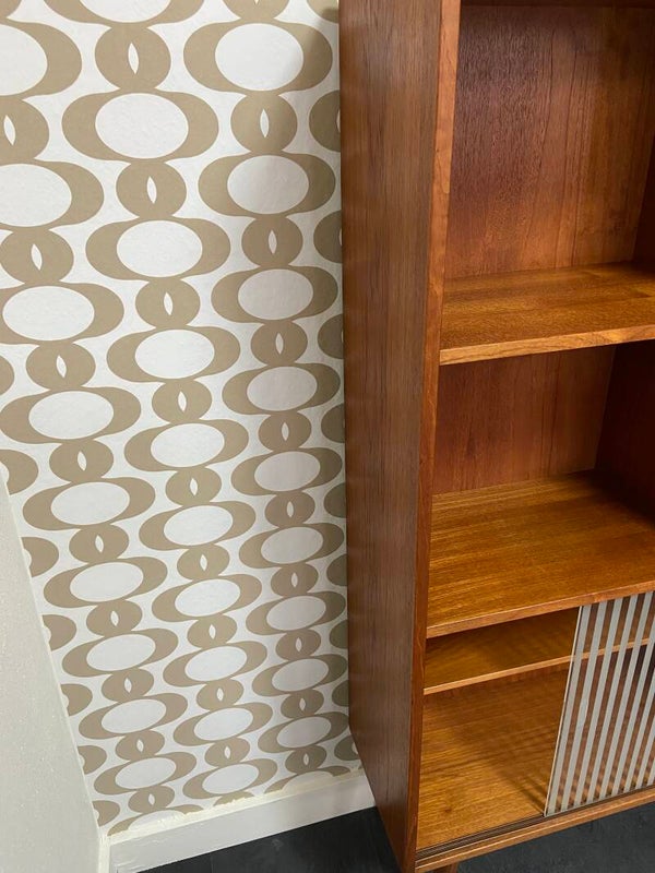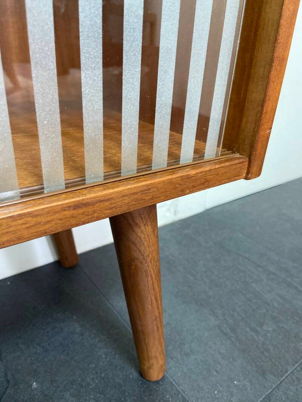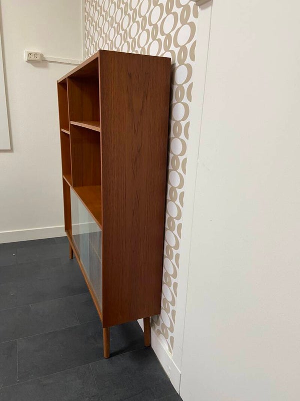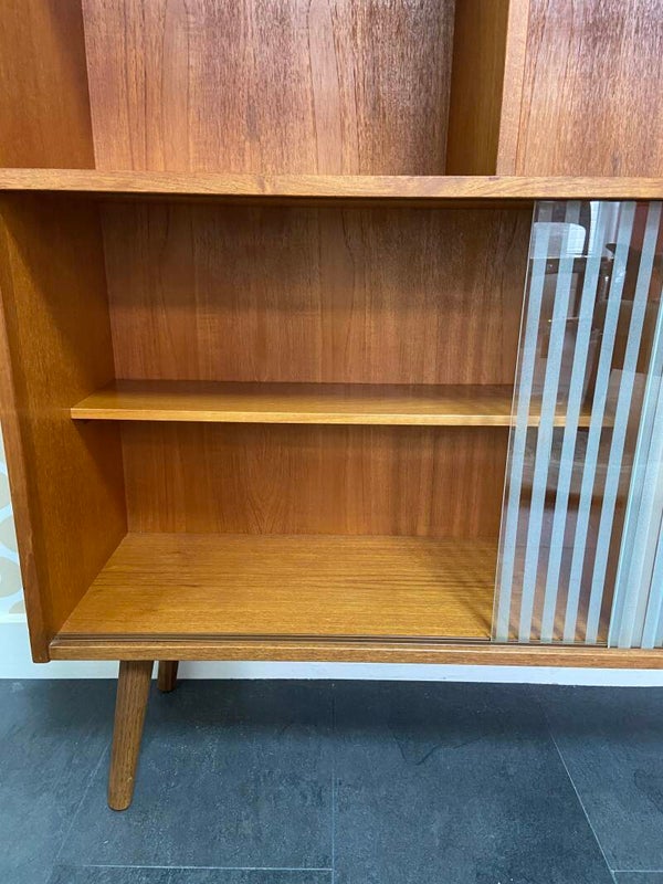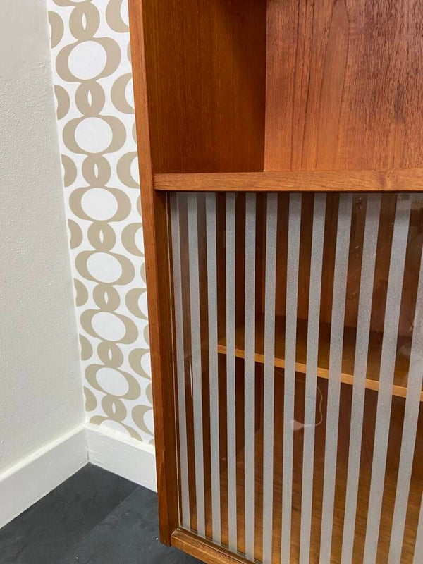 In deze staat en uitvoering zie je dit soort kasten maar weinig! Een prachtige boekenkast/wandkanst in teak met 2 schuifdeuren met bewerkt gezandstraald glas. De bovenste 2 planken in de kast zijn in hoogte verstelbaar. Leuk detail: de planken van de vitrine links en rechts zijn verspringend. De linkerplank is 15 cm diep en de rechter is 23 cm diep. De kast verkeert in topstaat.