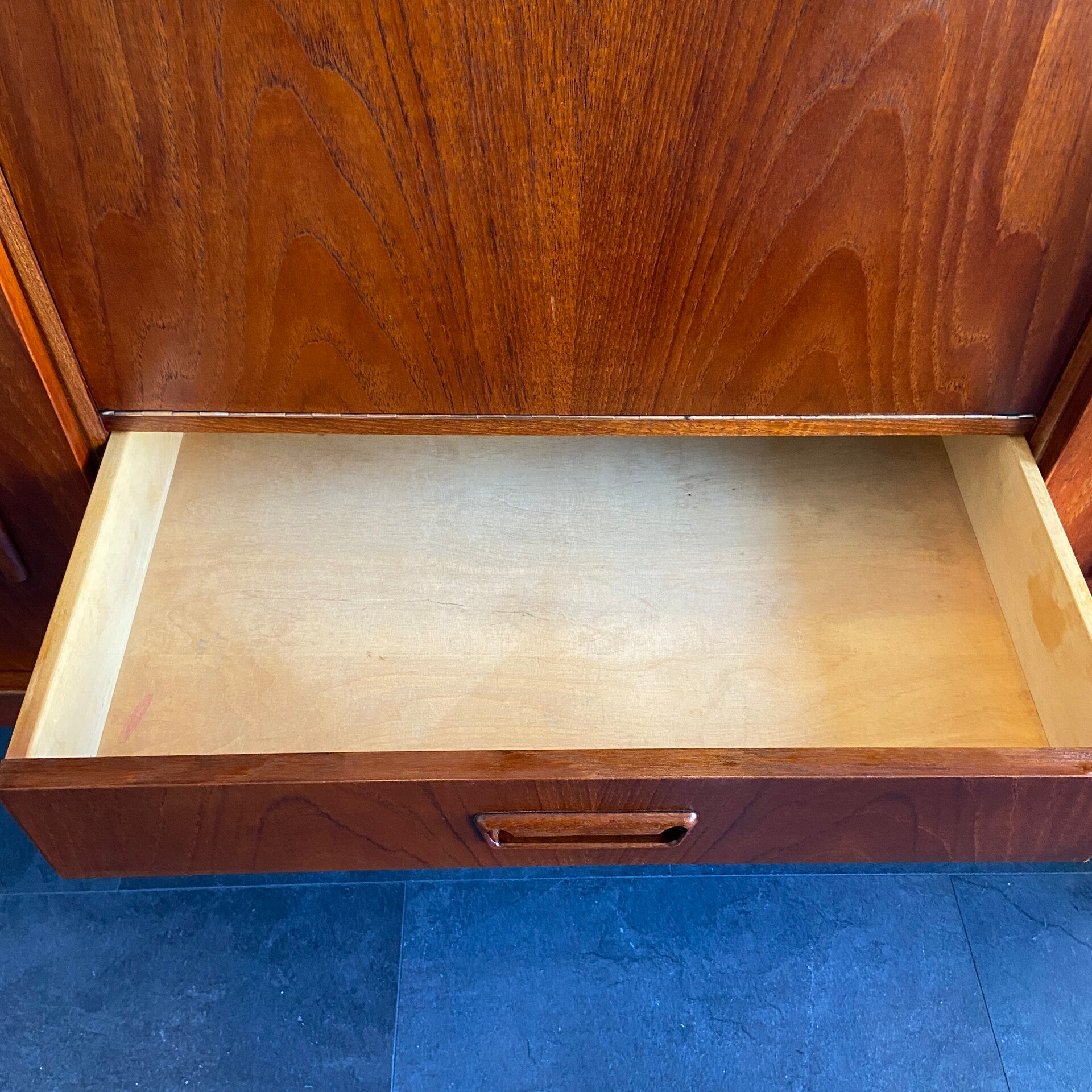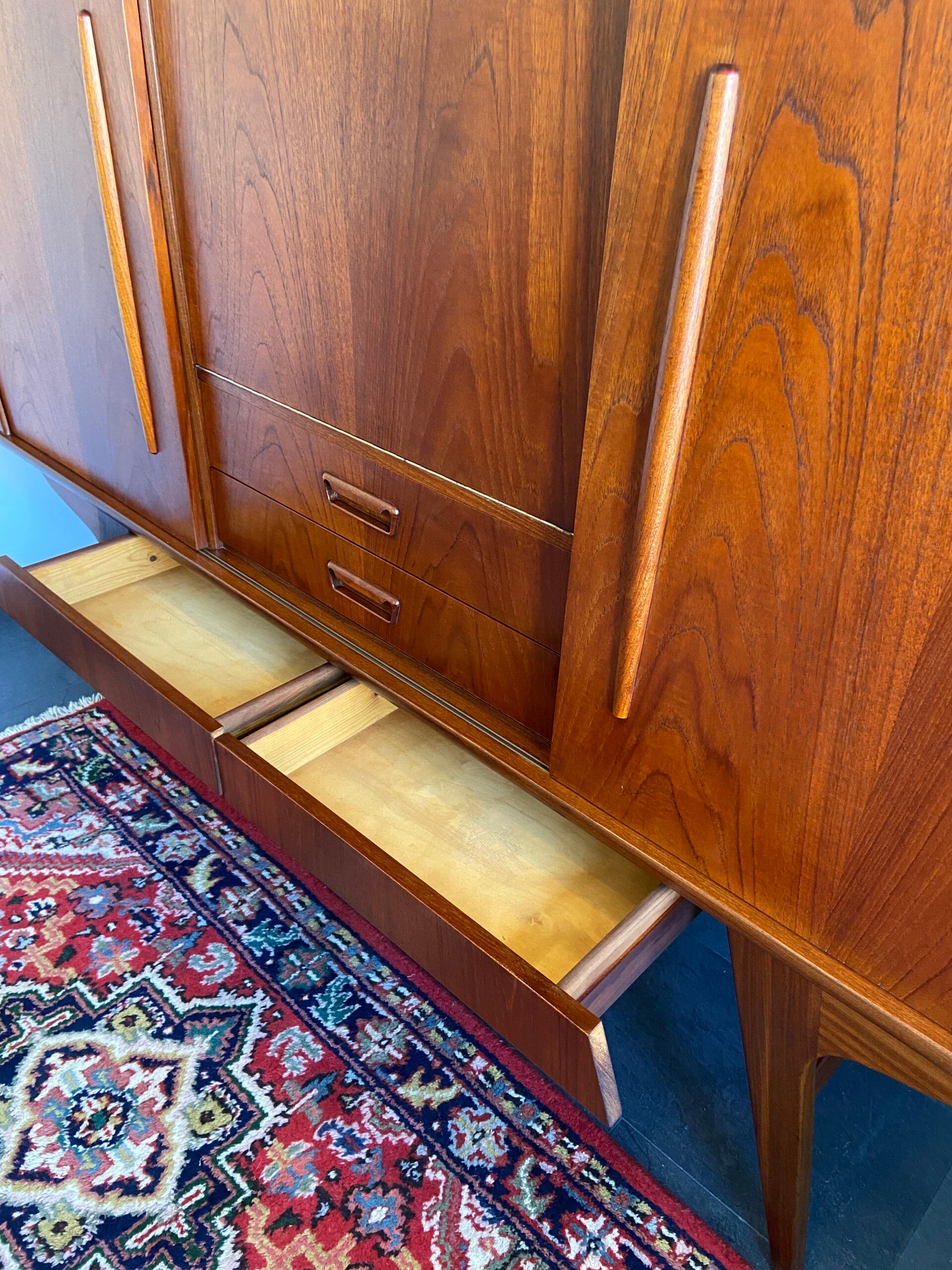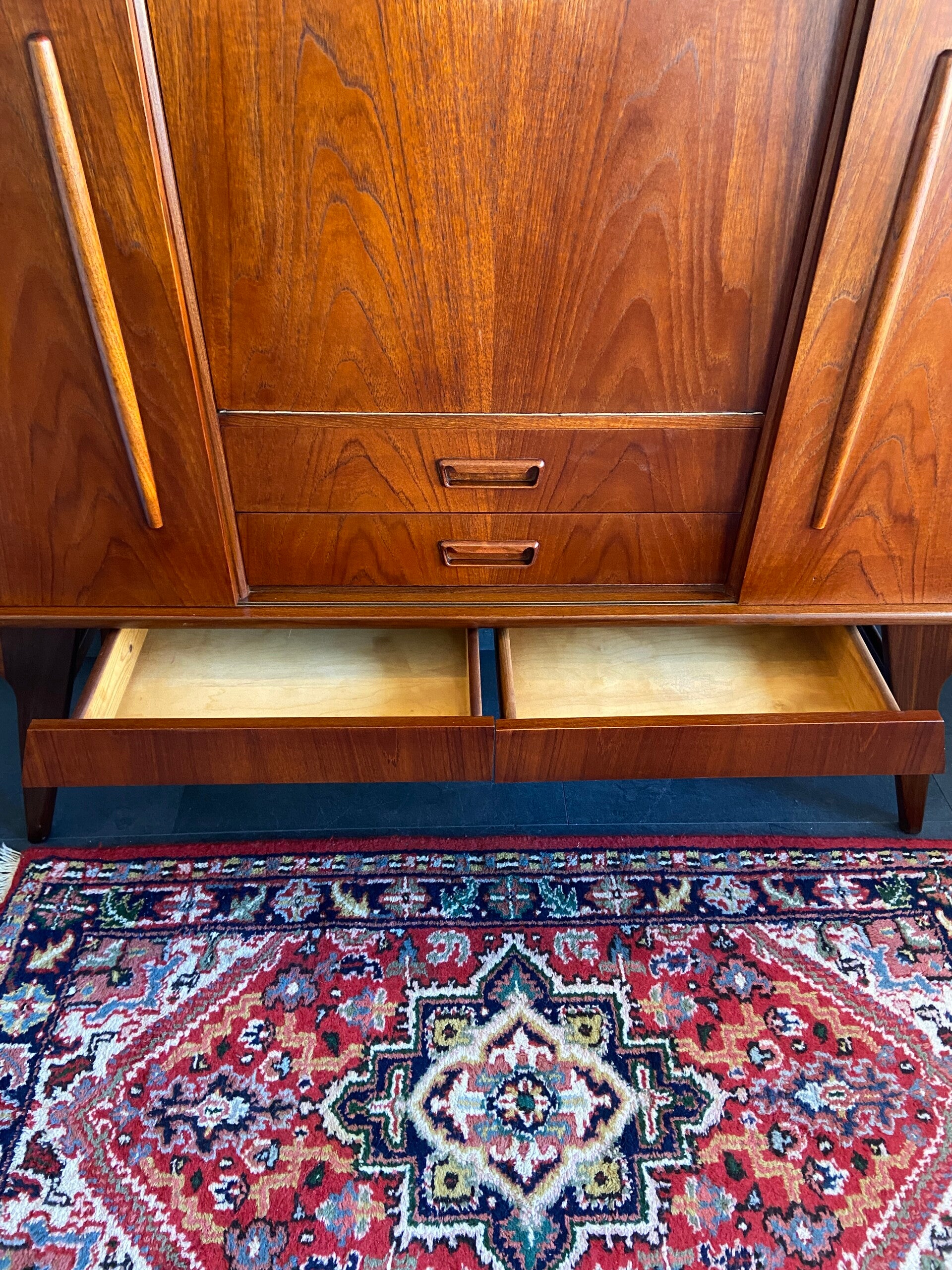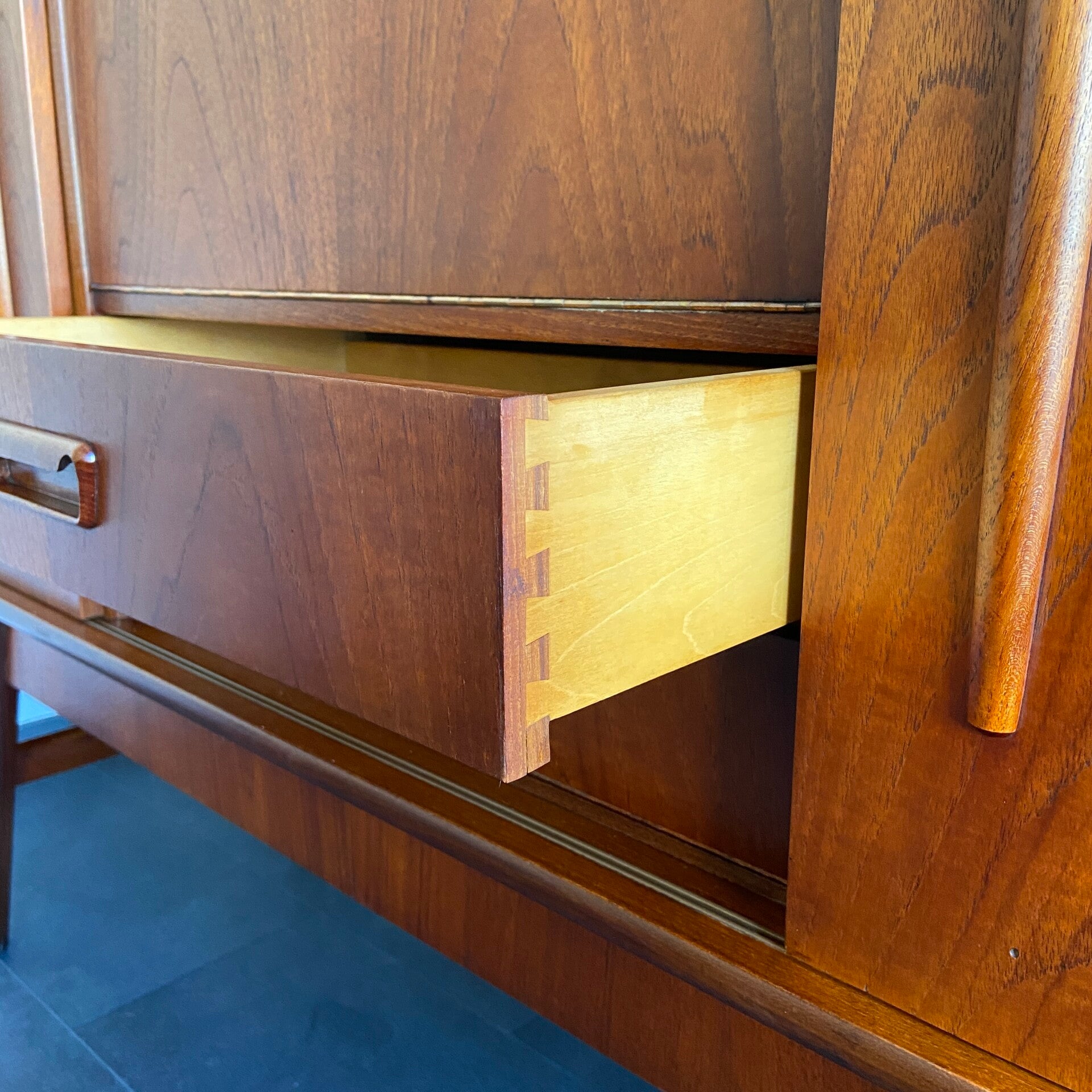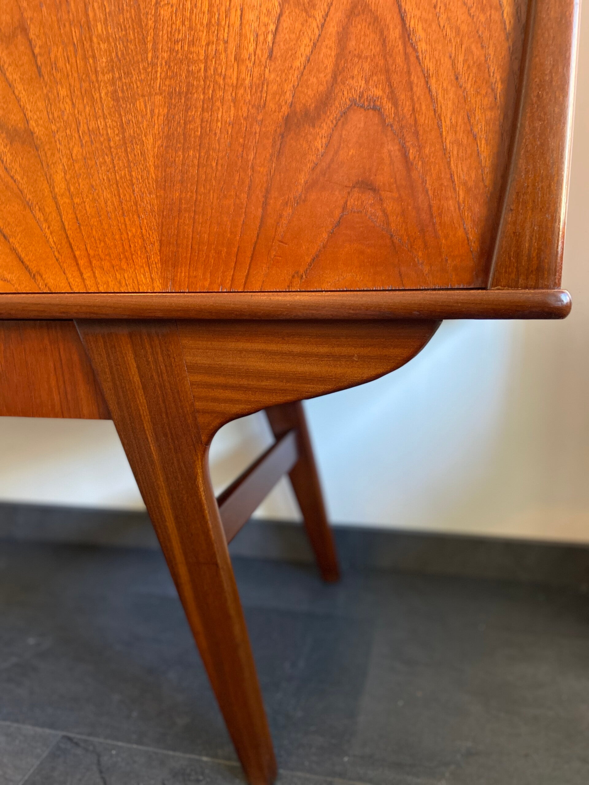 Dit Deense midboard is niet alleen een geweldige blikvanger in uw interieur maar biedt ook een zee aan opbergruimte! Aan weerskanten schuifdeuren met daarachter twee planken en in het midden een klepkast met bar. Let daarbij op de mooie gevormde planken met uitsparingen. Daaronder 2 brede laden, waarbij de tweede lade een extra inzetlade heeft voor bijvoorbeeld bestek. (Deze kunt u ook weglaten). En als extra opberger heeft de kast nog 2 'verborgen' laden onderaan! De staat en kwaliteit van afwerking zijn zeer goed en tonen zich in de sierlijke handgrepen op laden en deuren, de afgeronde hoeken, de zwaluwstaartverbindingen van de laden en het fraai gevormde onderstel van de kast. Op de rechterdeur is een oneffenheid zichtbaar; zie hiervoor de detailfoto.