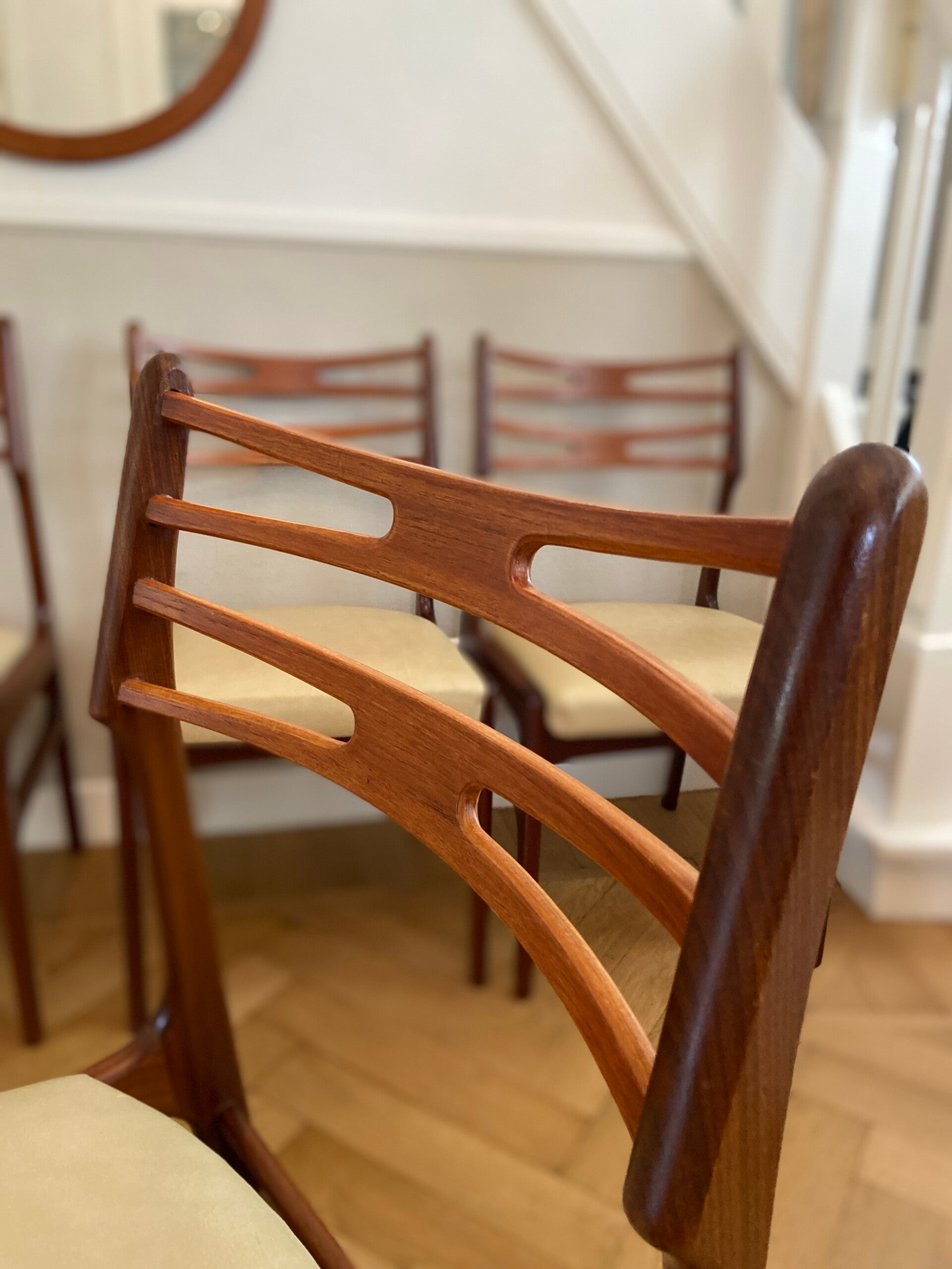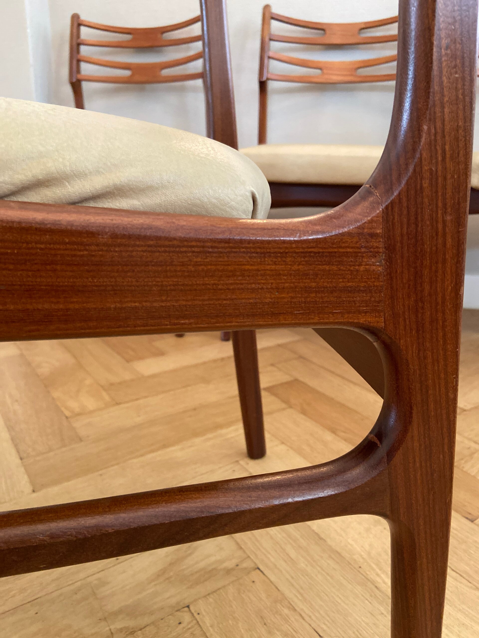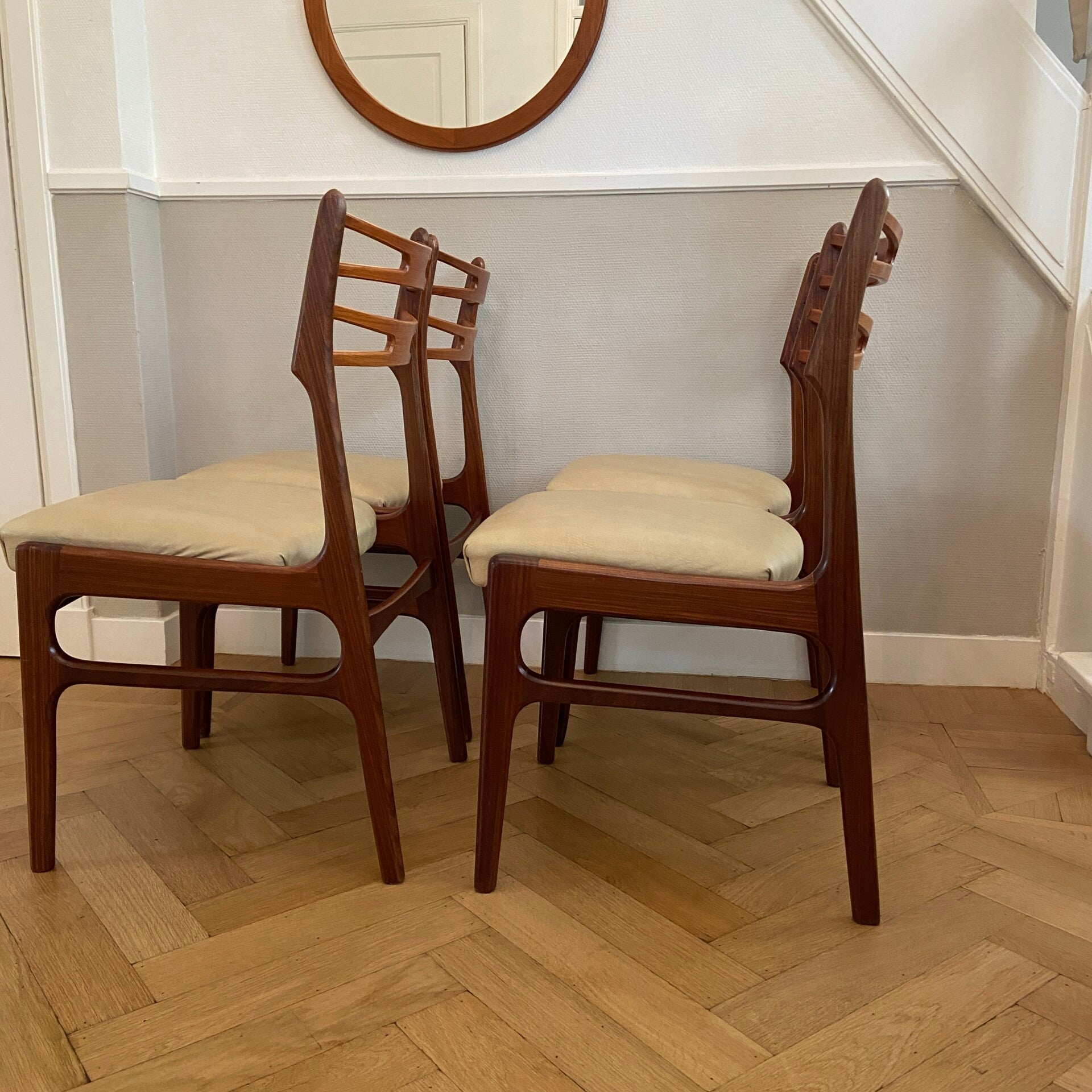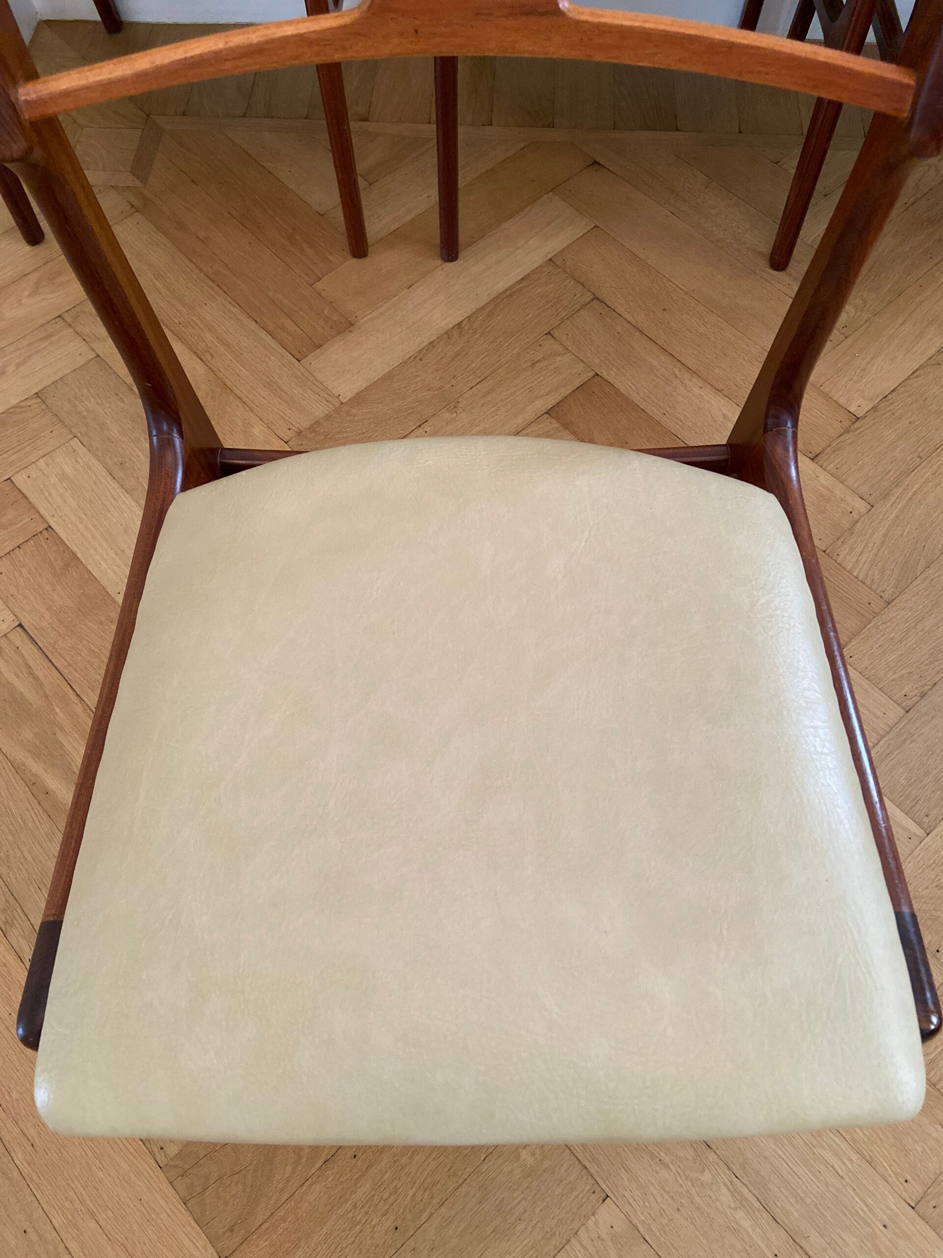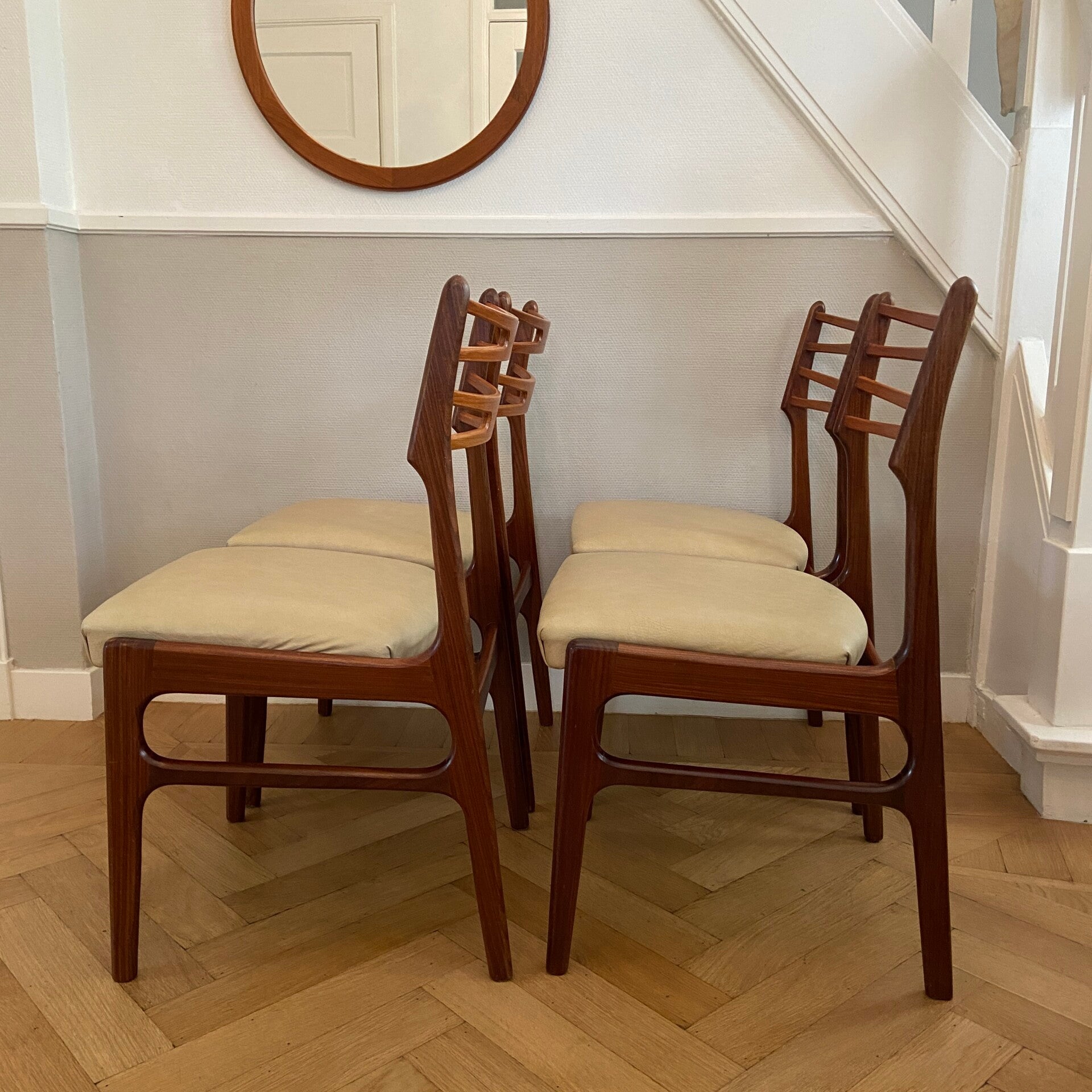 Zeer mooie set van 4 vintage Deense eetkamerstoelen, toegeschreven aan Johannes Andersen. De stoelen hebben een frame van sierlijk gevormd teakhout en zitting met zandkleurig kunstleder. De set verkeert in zeer mooie staat.