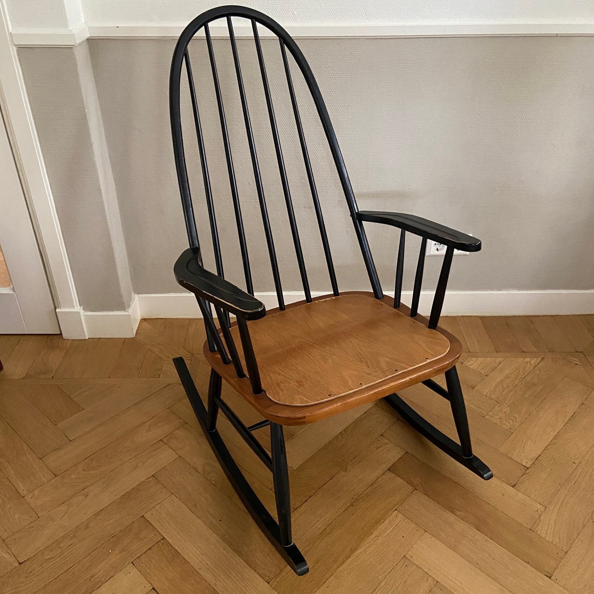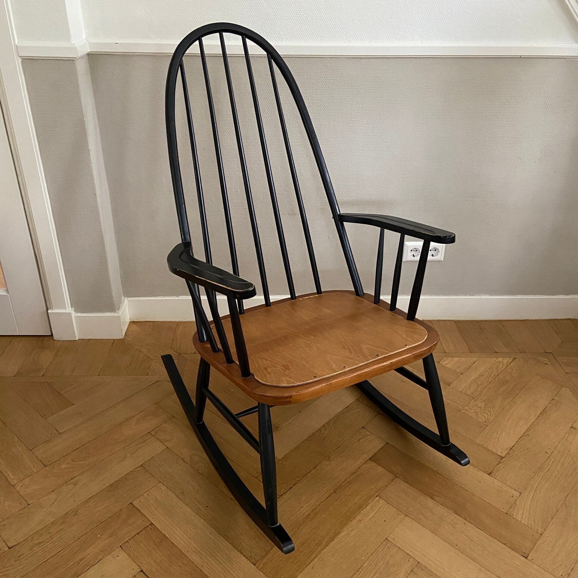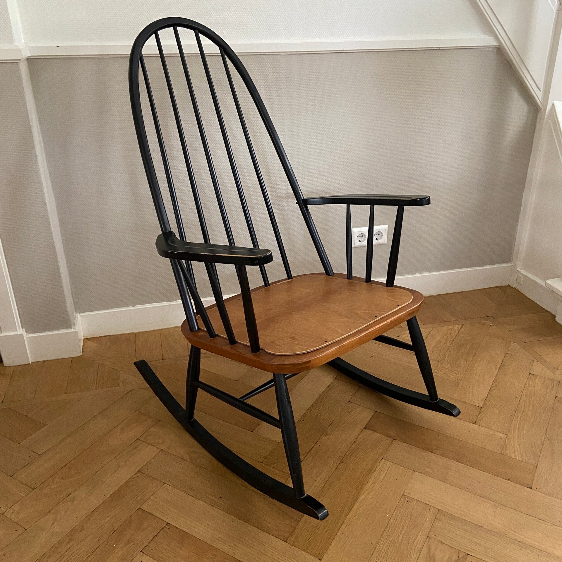 Schommelstoel in de tijdloze kleurencombinatie zwart met teak. Deze stoel doet sterk denken aan de uitvoering van Ilmari Tapiovaara, maar ik heb geen merkteken kunnen ontdekken. In een mooie vintage staat, waarbij het hout van het zitgedeelte is vervangen, zodat de stoel weer jaren mee kan. Een blikvanger in de kinderkamer, woonkamer of slaapkamer!