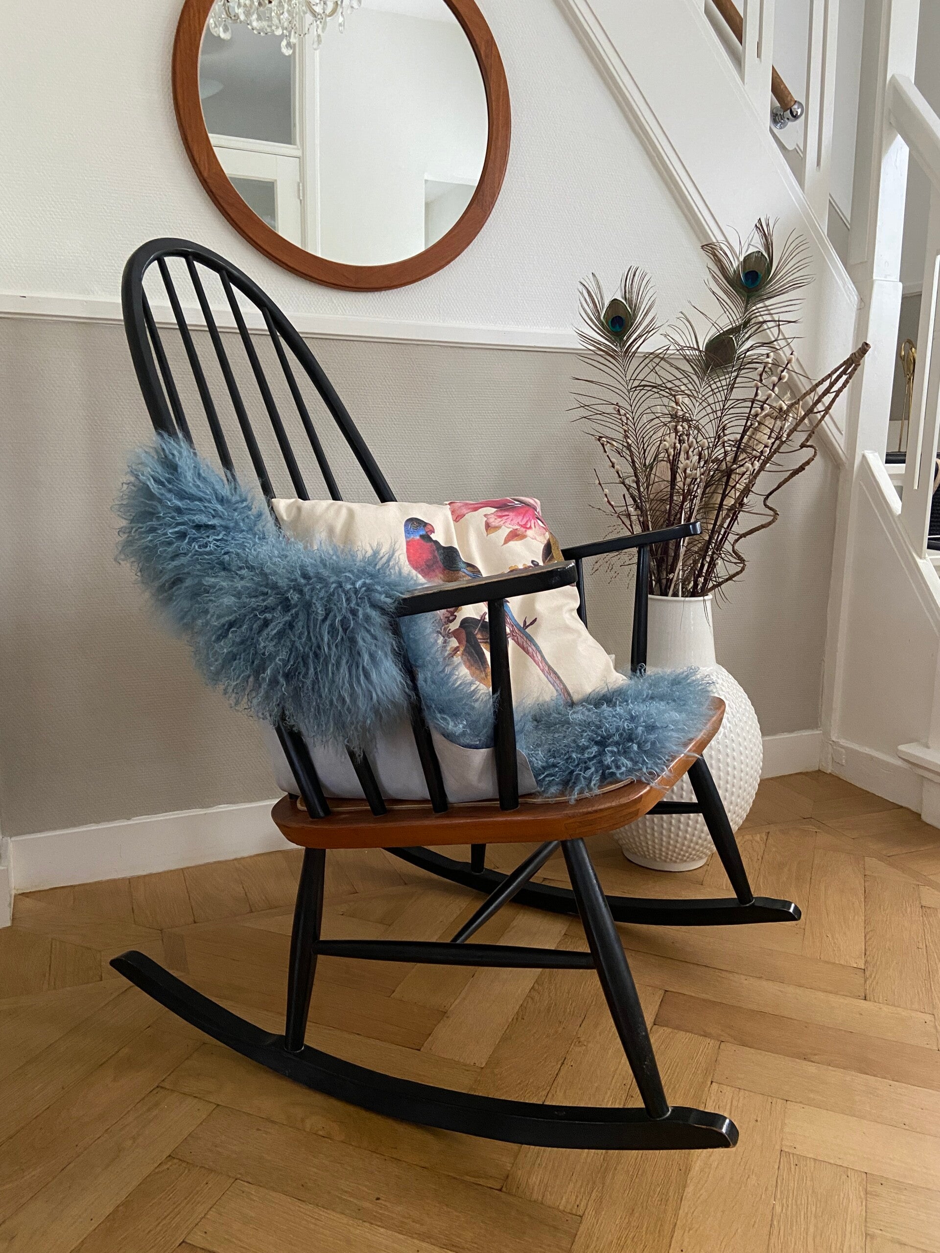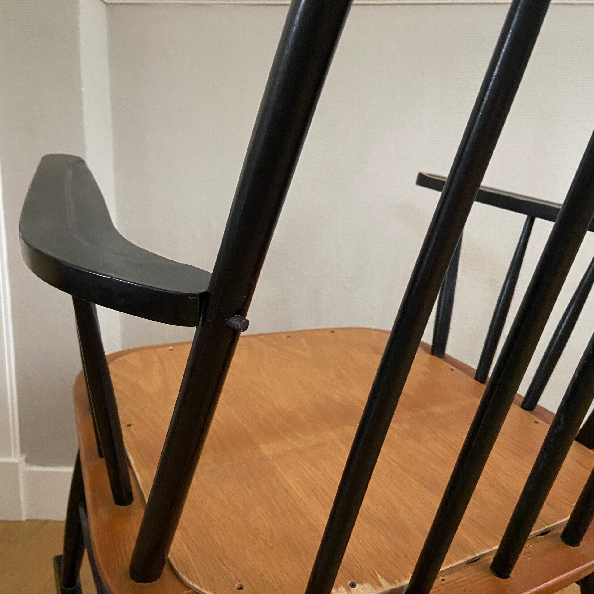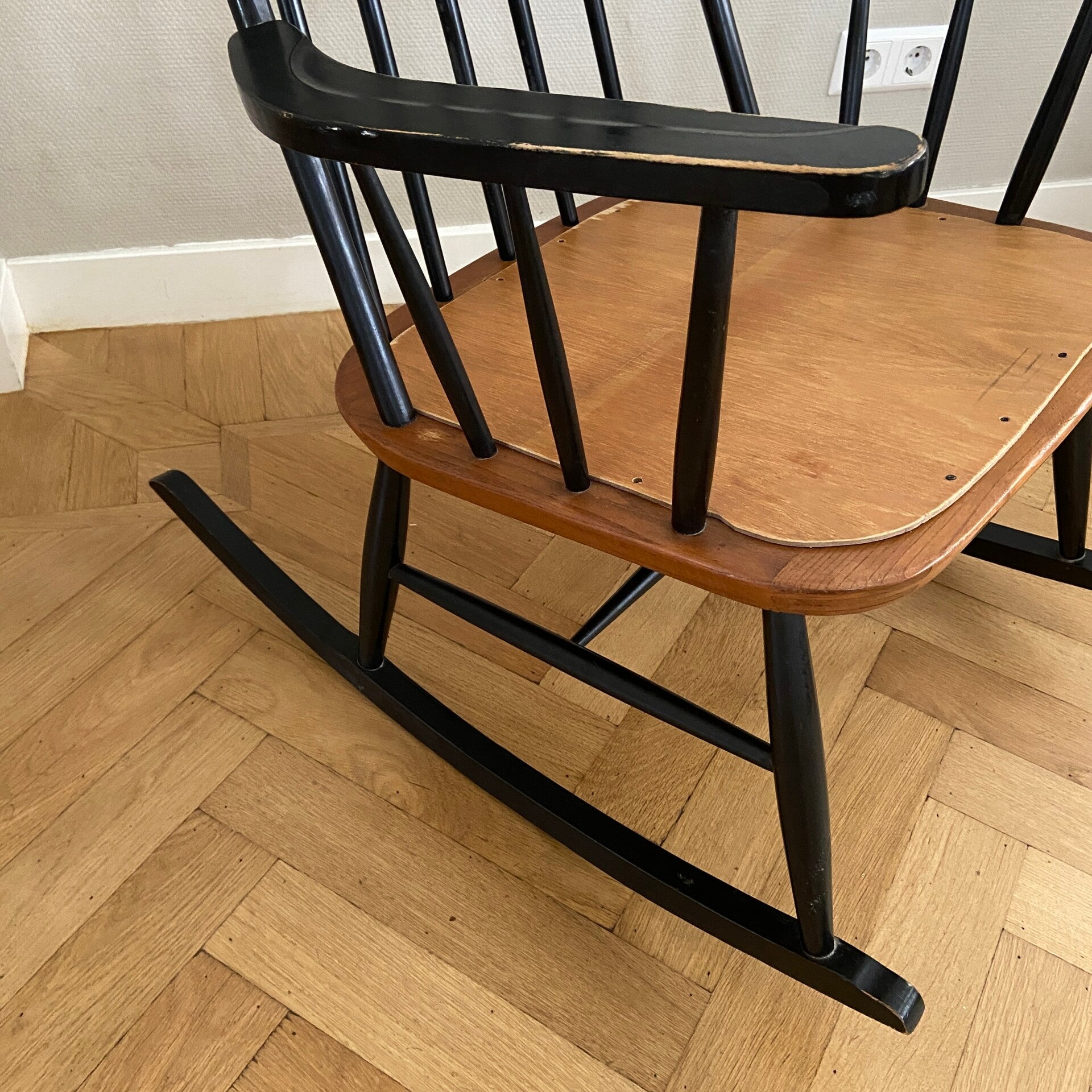 Schommelstoel in de tijdloze kleurencombinatie zwart met teak. Deze stoel doet sterk denken aan de uitvoering van Ilmari Tapiovaara, maar ik heb geen merkteken kunnen ontdekken. In een mooie vintage staat, waarbij het hout van het zitgedeelte is vervangen, zodat de stoel weer jaren mee kan. Een blikvanger in de kinderkamer, woonkamer of slaapkamer!