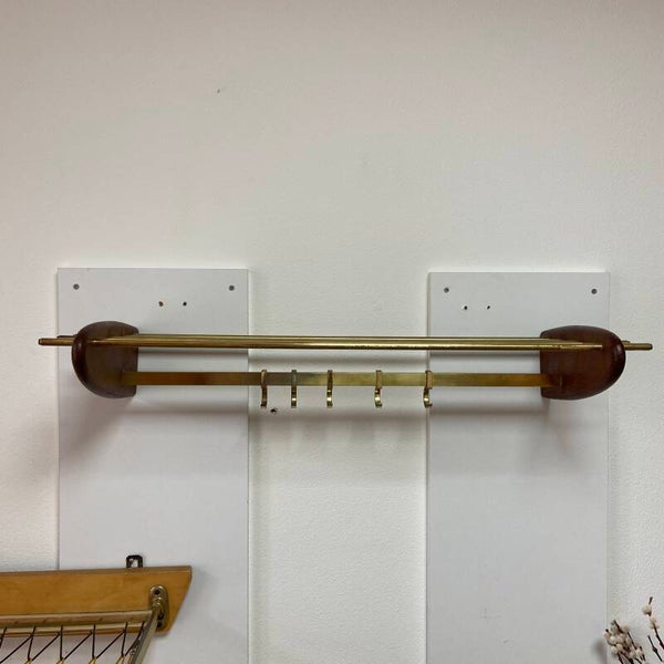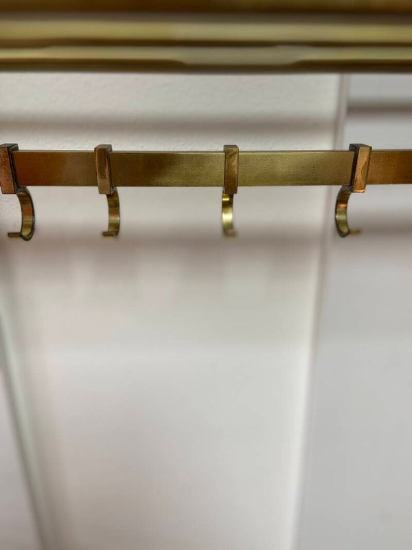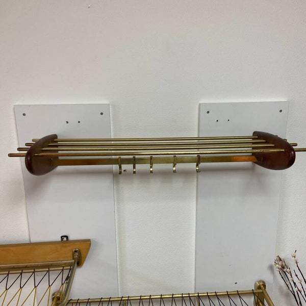 Bijzondere kapstok van messing met ovale teakhouten zijkanten. De kapstok heeft 5 jashaken en een hoedenplank.