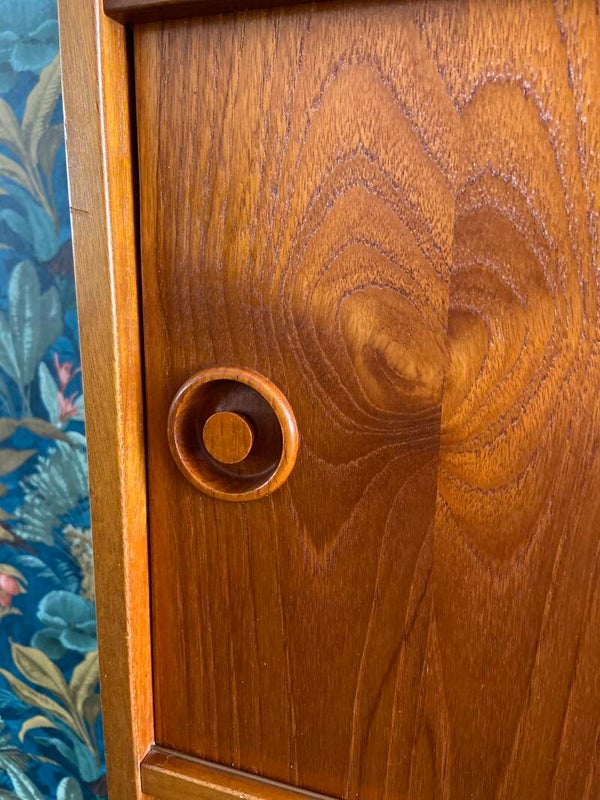 Bijzonder leuk model teak boekenkast met schuifdeuren. Achter de schuifdeuren een plank om je spullen overzichtelijk op te bergen. De kast verkeert in zeer mooi staat. Let ook even op de mooie houttekening en bijzondere handgrepen.