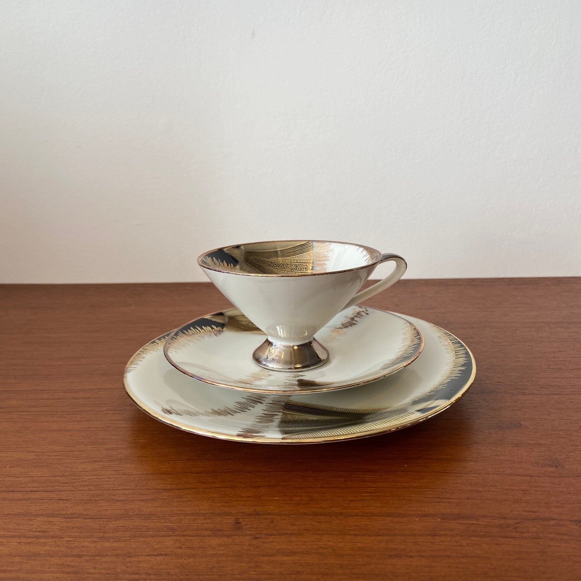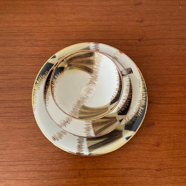 Een setje bestaande uit een kop en schotel en ontbijt/gebaksbord, in Duitsland worden deze sets sammeltassen genoemd. Leuk om te verzamelen of cadeau te doen! In goede staat, geen chips of andere gebreken. Gedecoreerd met zwart, gouden figuren.