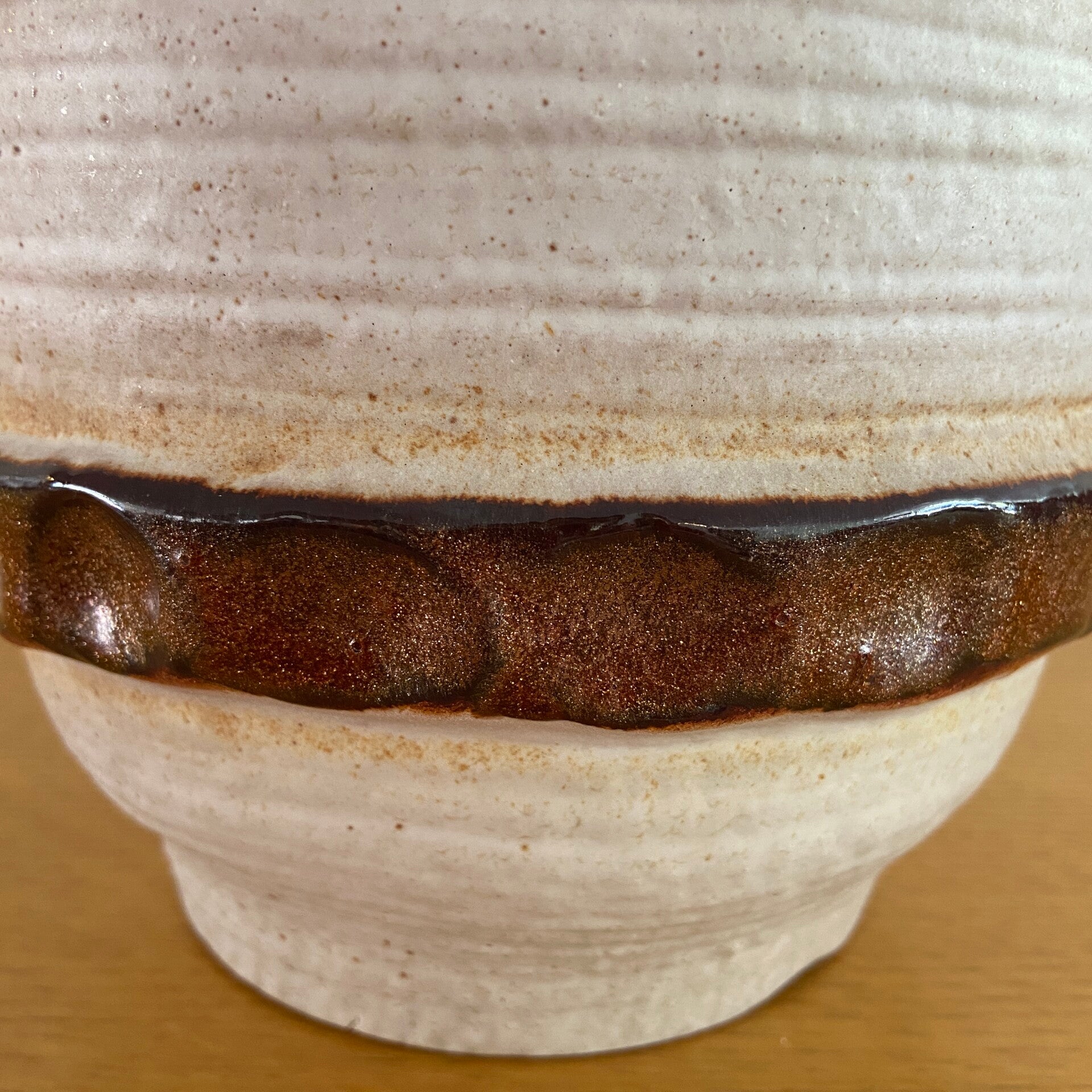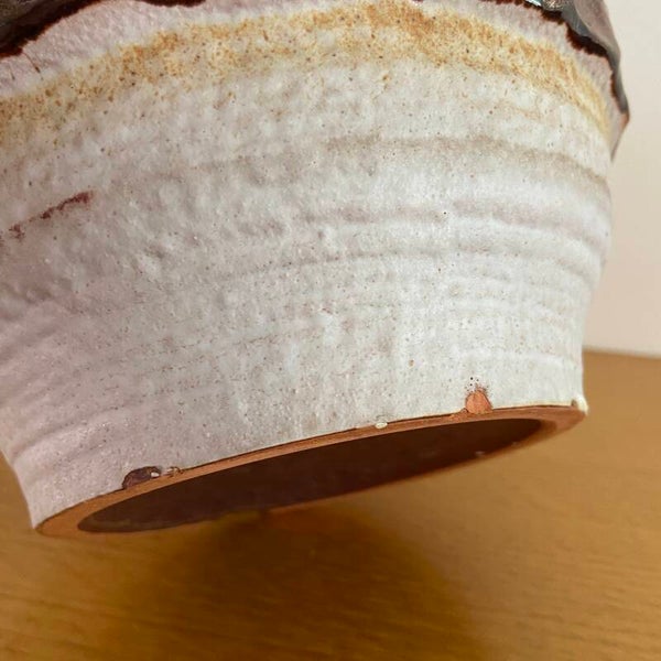 Wat een mooie, bijzonder gevormde vaas is dit exemplaar van Carstens! Prachtig als sierobject maar ook erg mooi met een paar bloemen of takken. De vaas is uitgevoerd in beigetinten met donkerbruine decoratieve ringen. De binnenkant is donkerbruin geglazuurd. De vaas is gemerkt: 323-25 en verkeert in een mooie staat met wat plekjes aan de onderrand; zie de detailfoto's. In de prijs is hiermee rekening gehouden.