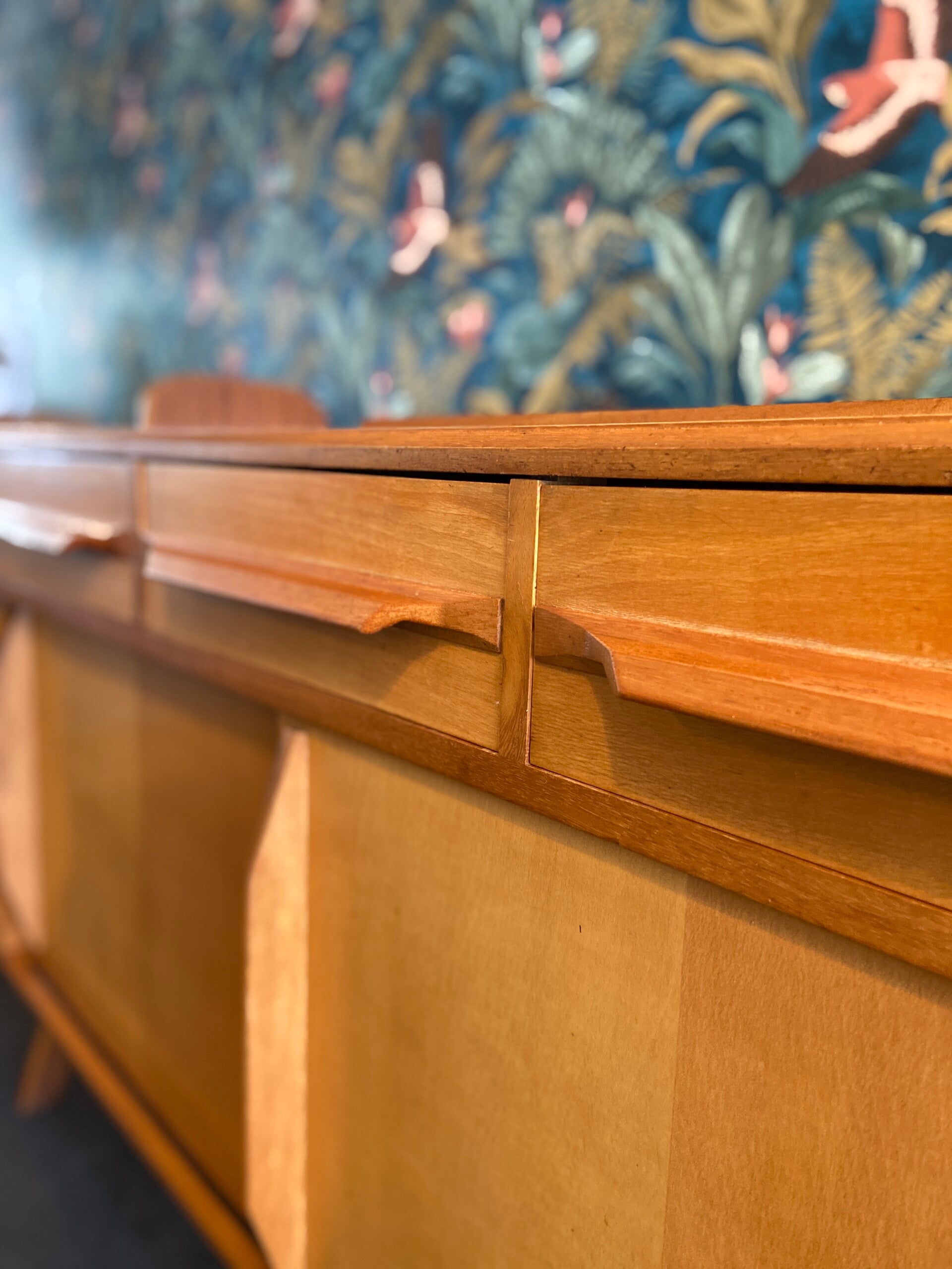 Zeldzaam exemplaar! Dit bijzonder mooie dressoir is ontworpen door Karl Nothhelfer voor Pollmann Möbel (Duitsland) en geproduceerd in de jaren '60. De kast is gemaakt van een combinatie van berkenhout en notenhout en heeft 3 laden en achter de schuifdeuren een plank. De handgrepen van de laden en deuren hebben een sierlijke vormgeving en ook de organisch gevormde staanders dragen bij aan de unieke uitstraling van dit dressoir. De kast verkeert in mooie vintage staat met wat lichte sporen van gebruik; zie hiervoor de detailfoto's.